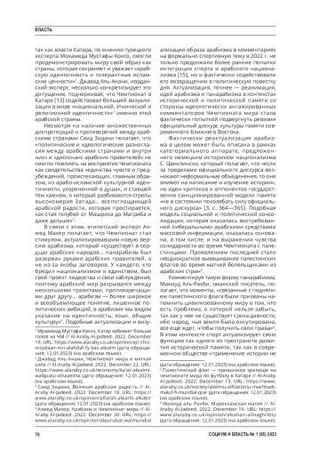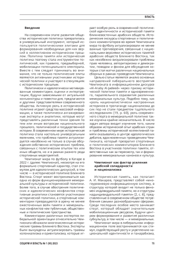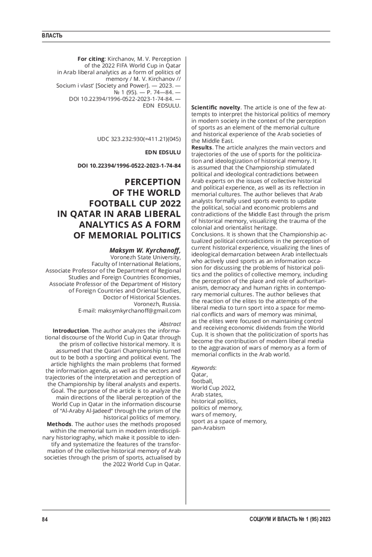 Выводы. Показано, что Чемпионат актуализировал политические противоречия в восприятии исторического опыта, визуализируя линии идеологического разграничения между арабскими интеллектуалами, которые активно использовали спорт как информационный повод для обсуждения проблем исторической политики и политики коллективной памяти, включая восприятие места и роли авторитаризма, демократии и прав человека в современных мемориальных культурах. Автор полагает, что реакция элит на попытки либеральных средств массовой информации превратить спорт в пространство мемориальных конфликтов и войн памяти была минимальной, так как элиты сфокусированы на сохранении контроля и получении экономических дивидендов от проведения Чемпионата мира. Показано, что политизация спорта стала вкладом современных либеральных СМИ в обострение войн памяти как формы мемориальных конфликтов в арабском мире.