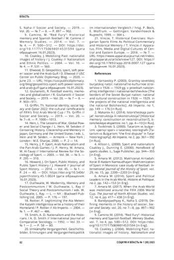 12. 	Giulianotti, R. Football events, memories and globalization / R. Giulianotti // Soccer and Society. - 2019. - Vol. 20. - № 7 - 8. - P. 903-911.