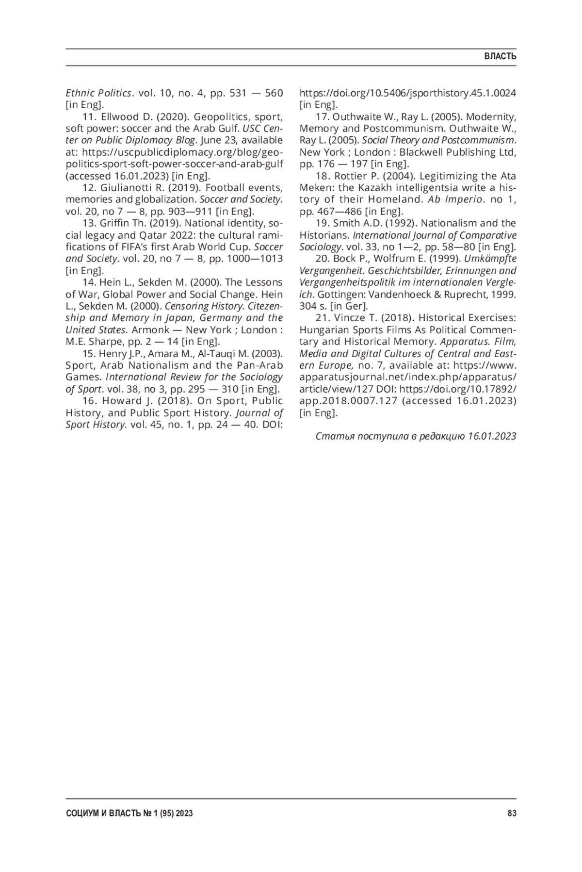 16. 	Howard, J. On Sport, Public History, and Public Sport History /j. Howard // Journal of Sport History. - 2018. - Vol. 45. - № 1. - Р. 24 - 40. - 10.5406/ jsporthistory.45.1.0024 (дата обращения: 16.01.2023).  DOI: 10.5406/jsporthistory.45.1.0024(