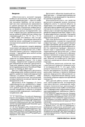 «Обеспеченность жителей городов, особенно мегаполисов, объектами социальной инфраструктуры — одна из наиболее значимых проблем, так как затраги - вает все слои населения вне зависимости от уровня дохода» [8]. Состав объектов, формирующих социальную инфраструктуру, не является устоявшимся и отличается в работах разных исследователей, при этом инфраструктура здравоохранения всегда является обязательным элементом классификаций [7, с. 70—71; 10, с. 17; 13, с. 1065—1066]. Это связано с тем, что здоровье населения — важнейшая компонента качества жизни, влияющая на социальноэкономическое развитие регионов и городов [17].
