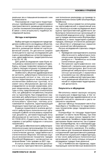 Методы. Теоретической и методологической основой исследования являются научные представления в области региональной экономики, пространственного и нормативного анализа. Научная новизна исследования заключается в оценке обеспеченности и насыщенности территорий амбулаторно-поликлиничными организациями, в контексте особенностей их пространственного размещения с учетом установленных нормативных требований.