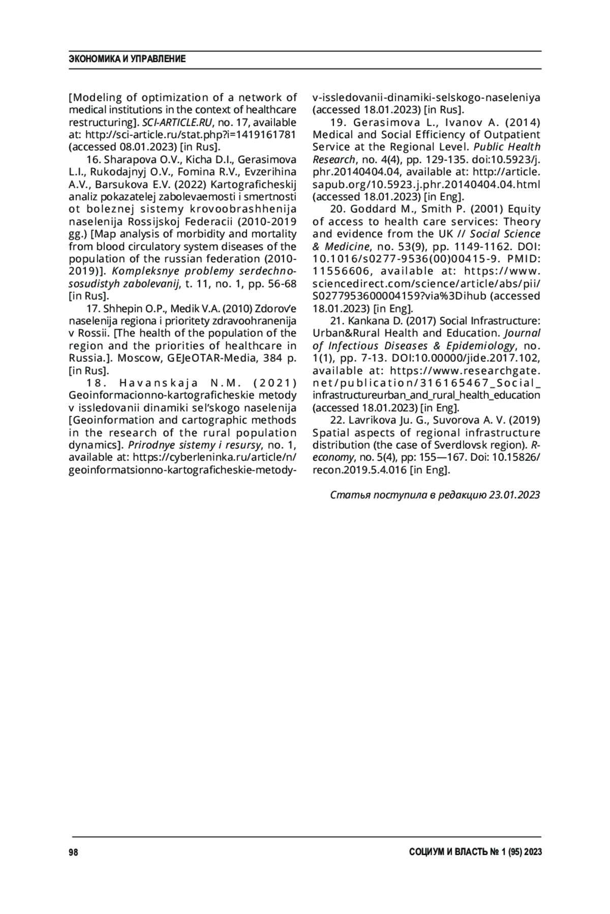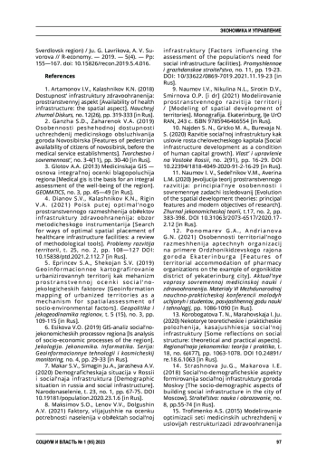 1. 	Артамонов, И. В. Доступность инфраструктуры здравоохранения: пространственный аспект / И. В. Артамонов, К. Н. Калашников // Научный журнал Дискурс. - 2018. - № 12(26). - С. 319-333.  EDN: YTVKCT