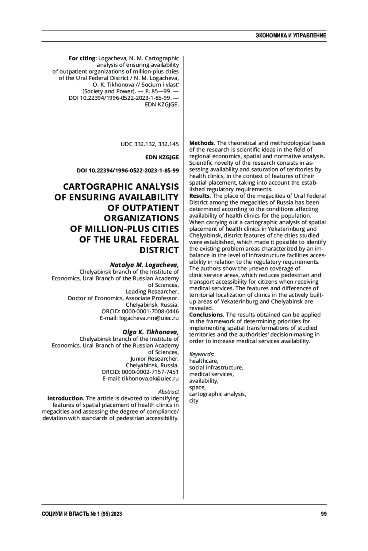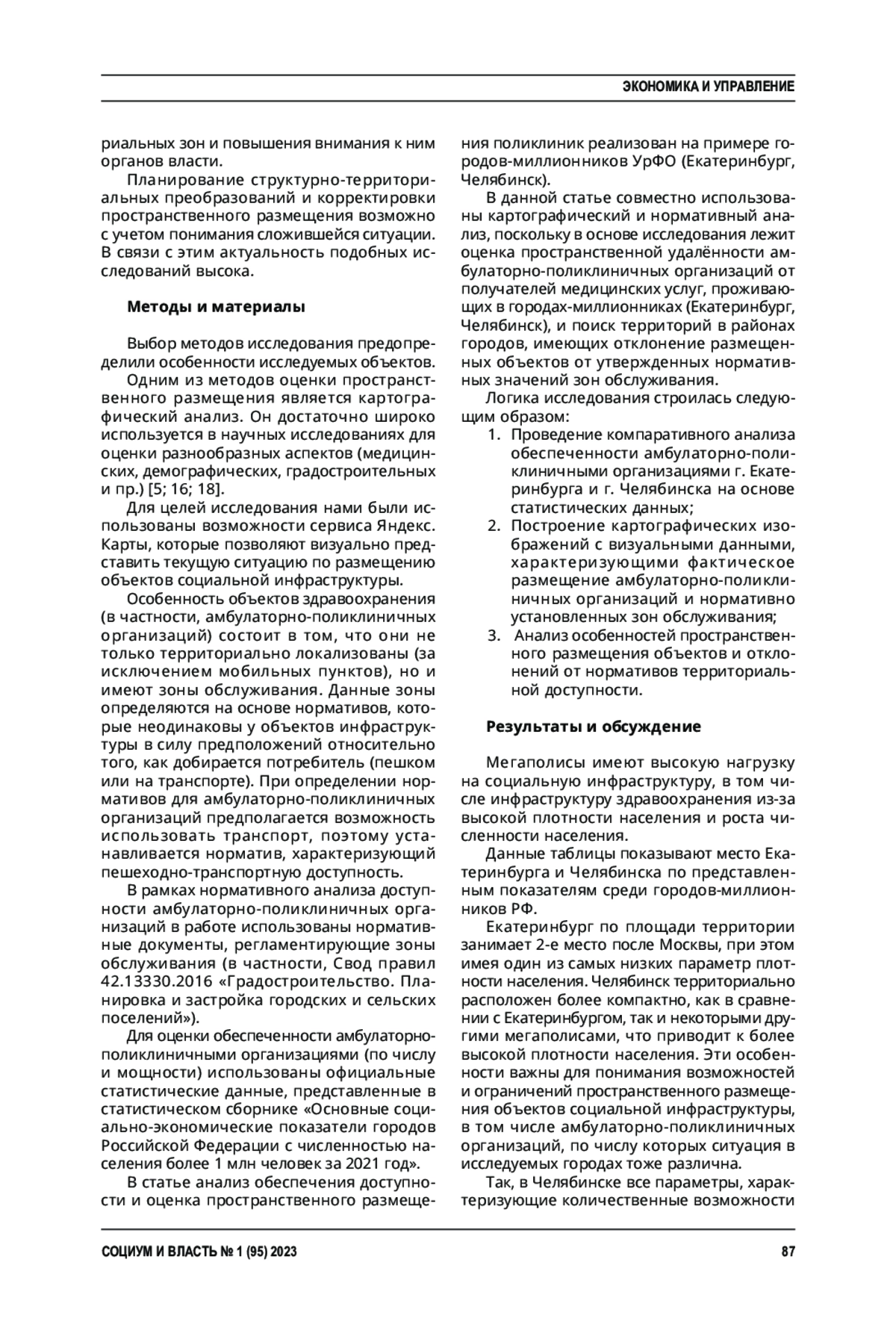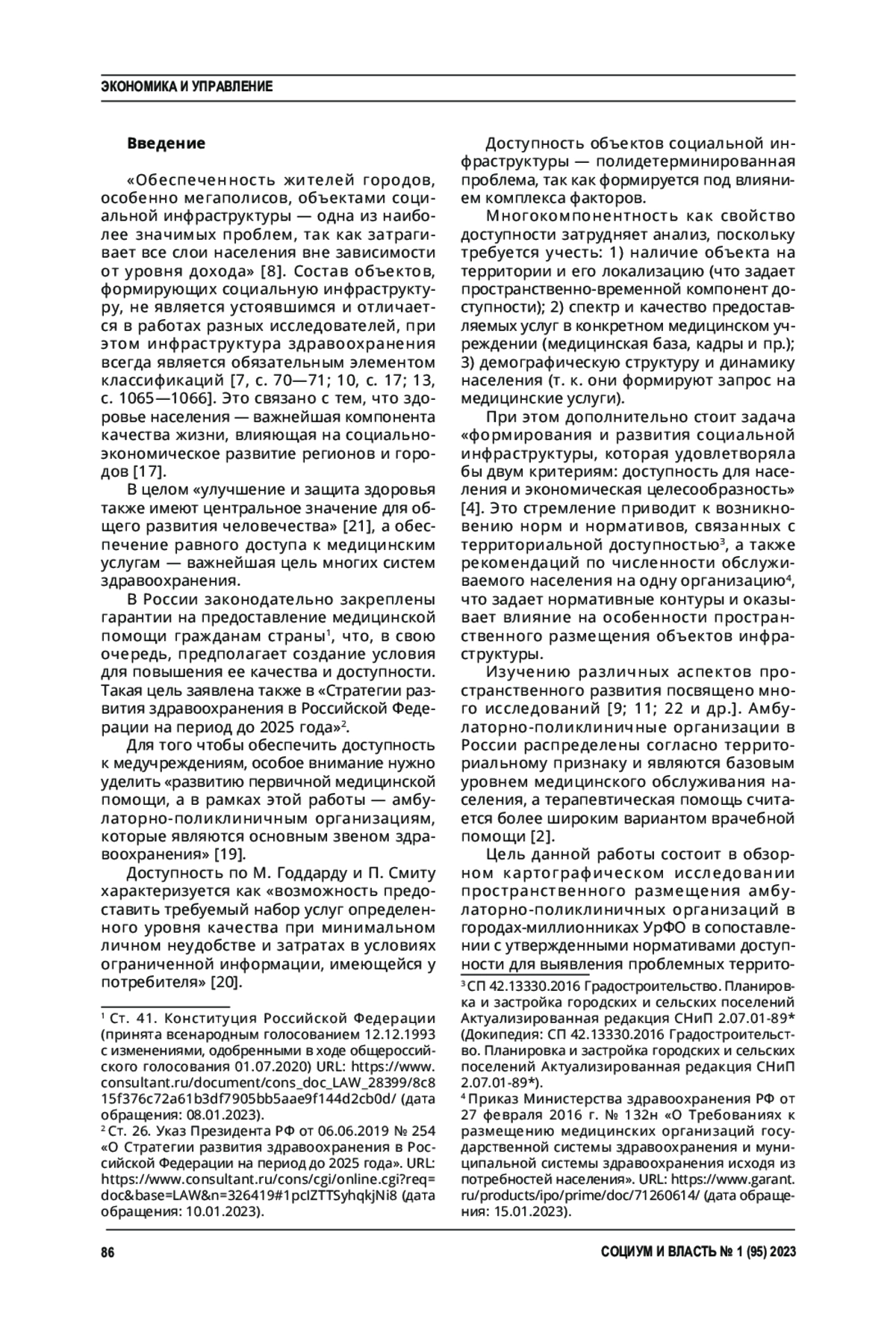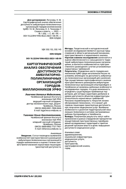 Введение. Статья посвящена выявлению особенностей пространственного размещения амбулаторно-поликлиничных организаций в городах-миллионниках и оценке степени соответствия/ отклонения нормативам пешеходно транспортной доступности.