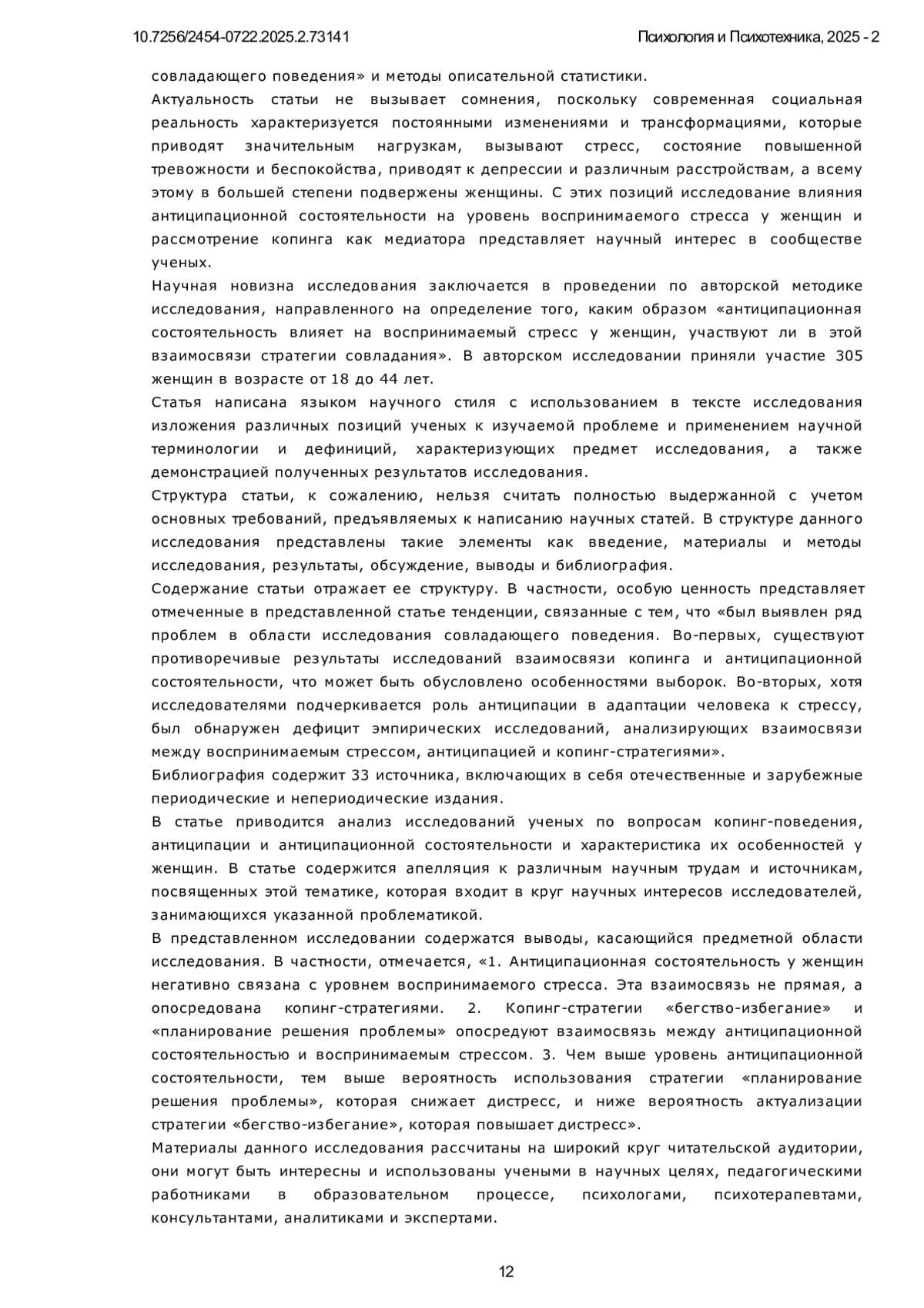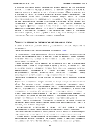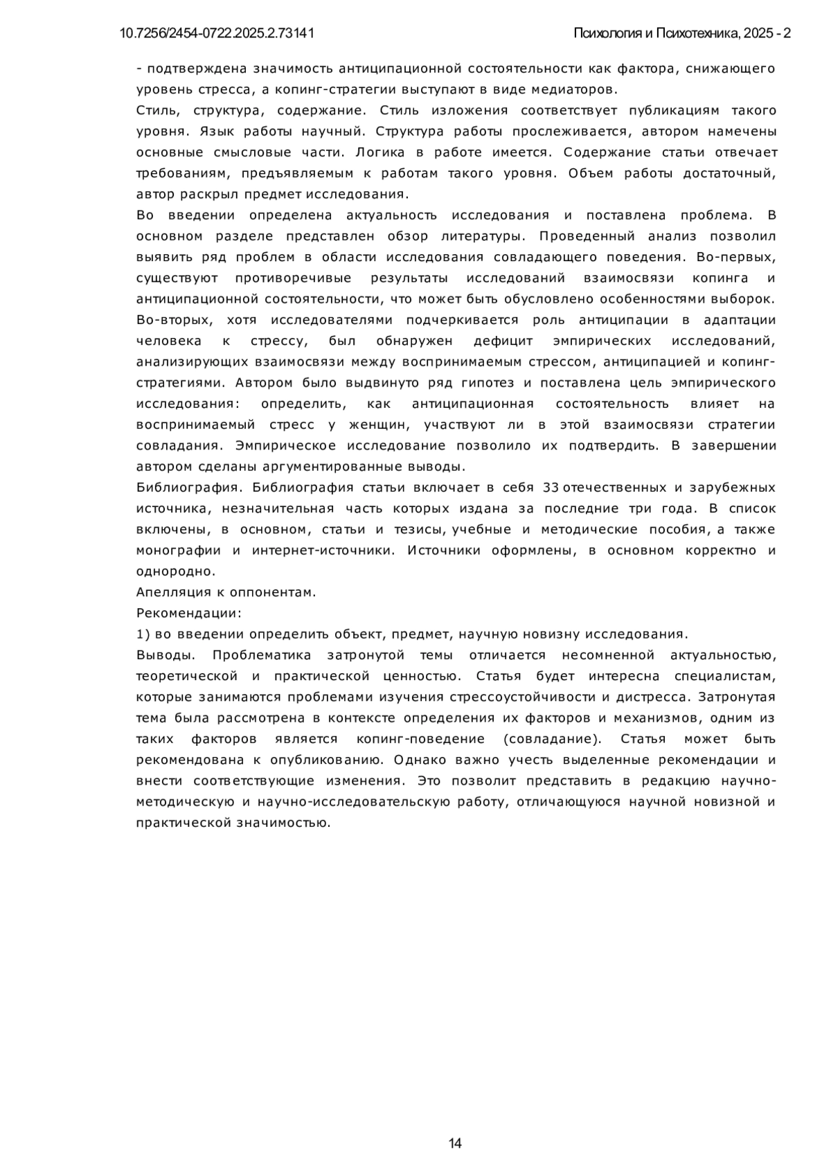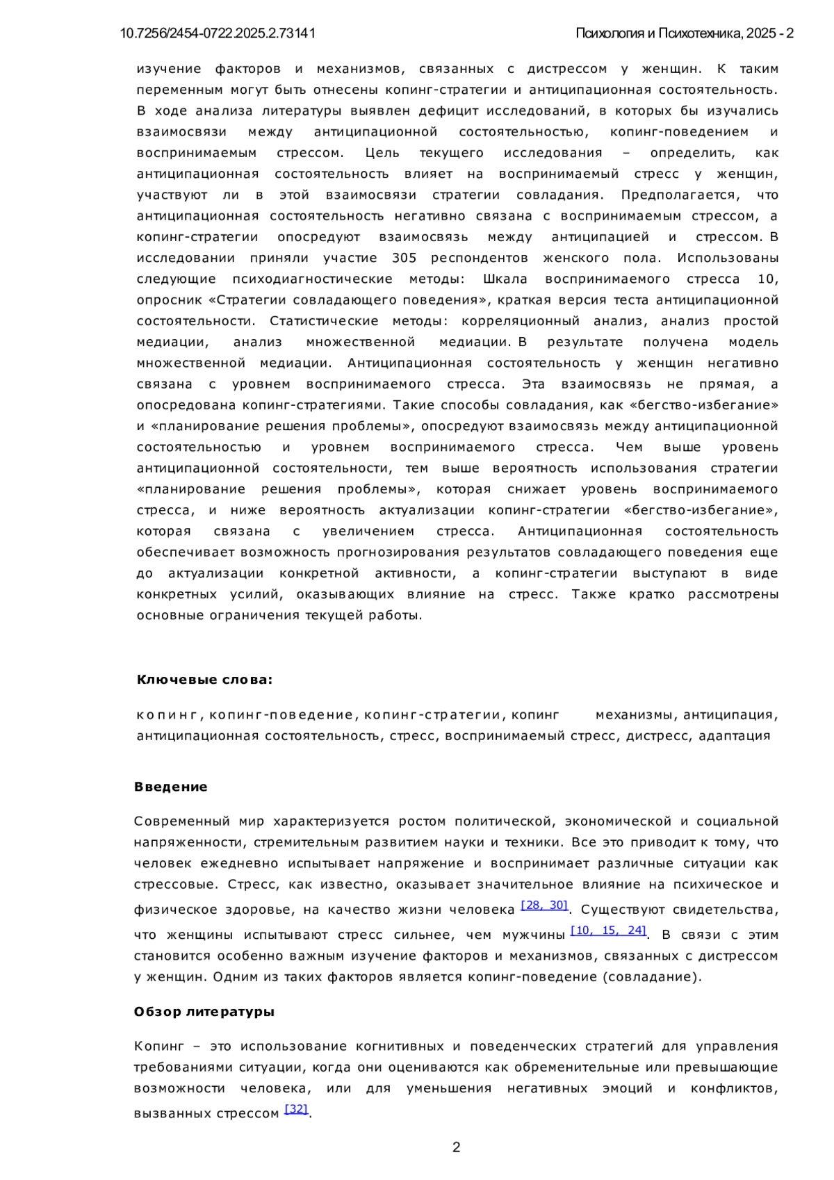 Ежедневно человек испытывает напряжение и воспринимает различные ситуации как стрессовые. Стресс, как известно, оказывает влияние на психическое и физическое здоровье. Существуют свидетельства, указывающие на то, что женщины сильнее испытывают дистресс, чем мужчины. В связи с этим становится актуальным изучение факторов и механизмов, связанных с дистрессом у женщин. К таким переменным могут быть отнесены копинг-стратегии и антиципационная состоятельность. В ходе анализа литературы выявлен дефицит исследований, в которых бы изучались взаимосвязи между антиципационной состоятельностью, копинг-поведением и воспринимаемым стрессом. Цель текущего исследования - определить, как антиципационная состоятельность влияет на воспринимаемый стресс у женщин, участвуют ли в этой взаимосвязи стратегии совладания. Предполагается, что антиципационная состоятельность негативно связана с воспринимаемым стрессом, а копинг-стратегии опосредуют взаимосвязь между антиципацией и стрессом. В исследовании приняли участие 305 респондентов женского пола. Использованы следующие психодиагностические методы: Шкала воспринимаемого стресса 10, опросник «Стратегии совладающего поведения», краткая версия теста антиципационной состоятельности. Статистические методы: корреляционный анализ, анализ простой медиации, анализ множественной медиации. В результате получена модель множественной медиации. Антиципационная состоятельность у женщин негативно связана с уровнем воспринимаемого стресса. Эта взаимосвязь не прямая, а опосредована копинг-стратегиями. Такие способы совладания, как «бегство-избегание» и «планирование решения проблемы», опосредуют взаимосвязь между антиципационной состоятельностью и уровнем воспринимаемого стресса. Чем выше уровень антиципационной состоятельности, тем выше вероятность использования стратегии «планирование решения проблемы», которая снижает уровень воспринимаемого стресса, и ниже вероятность актуализации копинг-стратегии «бегство-избегание», которая связана с увеличением стресса. Антиципационная состоятельность обеспечивает возможность прогнозирования результатов совладающего поведения еще до актуализации конкретной активности, а копинг-стратегии выступают в виде конкретных усилий, оказывающих влияние на стресс. Также кратко рассмотрены основные ограничения текущей работы.