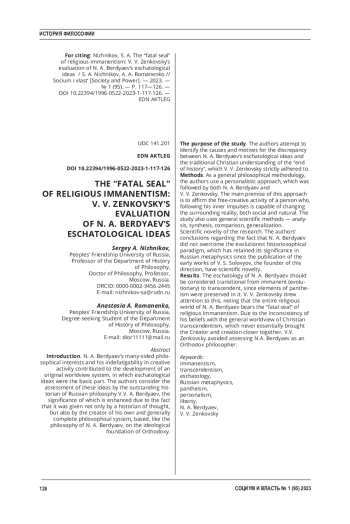 Методы. В качестве общефилософской методологии использовался персоналистский подход, которого придерживались как Н. А. Бердяев, так и В. В. Зеньковский. Основная предпосылка этого подхода состоит в утверждении свободнотворческой активности личности, способной, исходя из своих внутренних побуждений, изменять окружающую реальность, как социальную, так и природную. В исследовании применялись также общенаучные методы - анализ, синтез, сравнение, обобщение. Научная новизна исследования. Научной новизной обладают выводы авторов относительно того, что Н. А. Бердяевым не была преодолена эволюционистская историософская парадигма, сохраняющая свое значение в русской метафизике со времени публикации ранних работ В. С. Соловьева, родоначальника этого направления.