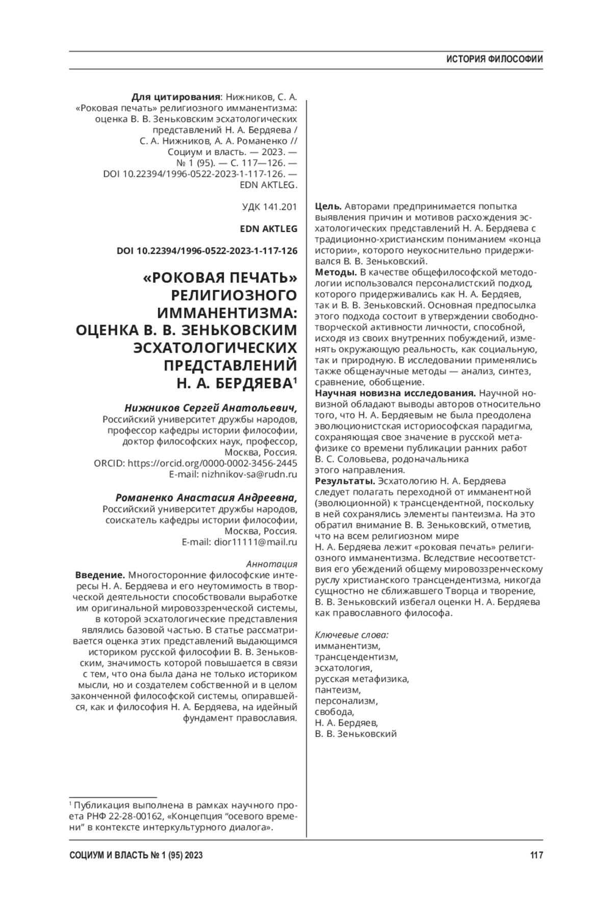 Цель. Авторами предпринимается попытка выявления причин и мотивов расхождения эсхатологических представлений Н. А. Бердяева с традиционно-христианским пониманием «конца истории», которого неукоснительно придерживался В. В. Зеньковский.