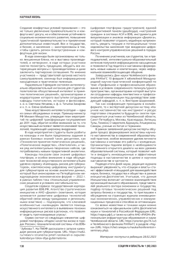 Выводы. Технологический тренд конституируется данными технических наук и инженерными разработками с социальной направленностью Социотренд определяется спектром областей применения технологий. Сделан вывод о диффузии двух трендов и обслуживающих эти тренды дискурсов. В дискурсивном плане технотренд служит конструированию строго научного дискурса, основанного не на абстрактных, а на конкретных и точных пропозициях. Особое внимание уделяется дискурсивному мейнстриму «смартизации», характерному для научного контента второго десятилетия XXI в. Сделан акцент на антропологических рисках экстраполяции «смартизации» на специализированные практики.