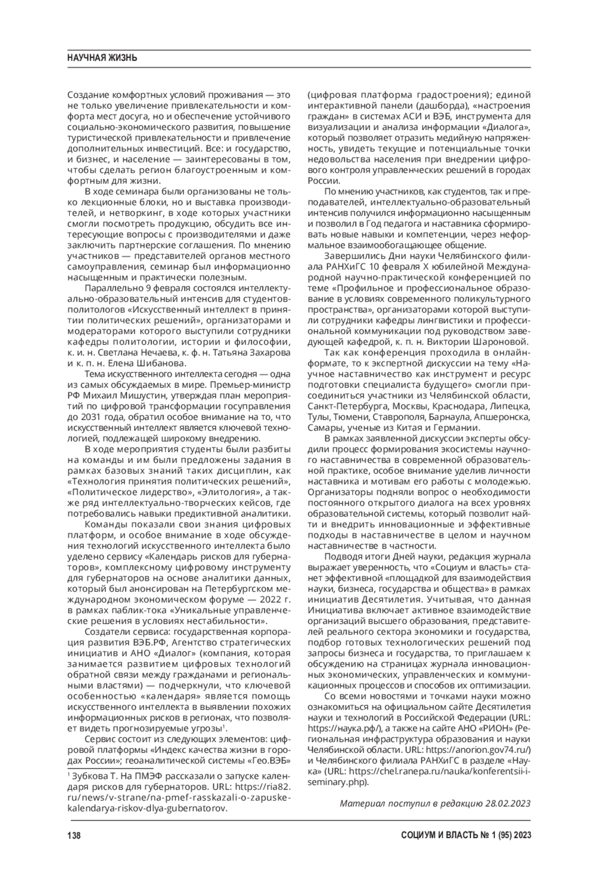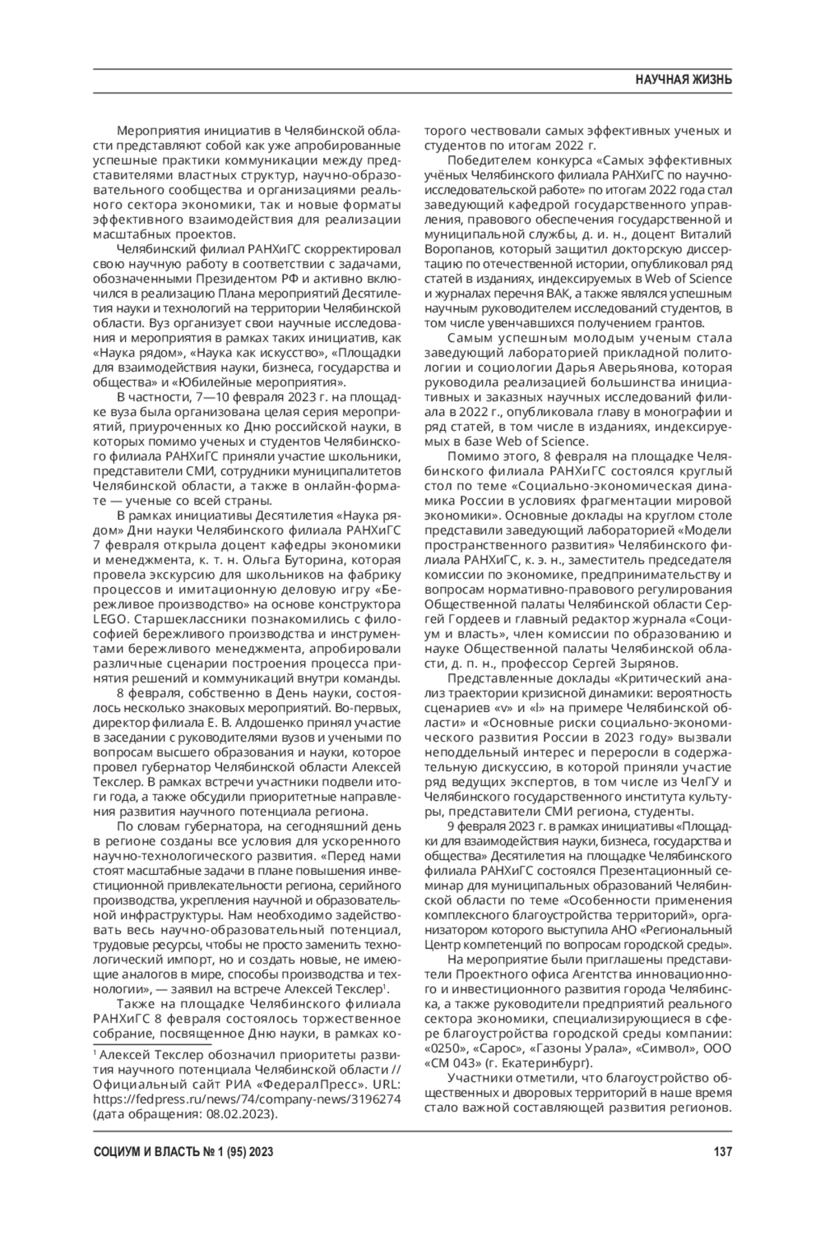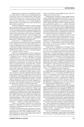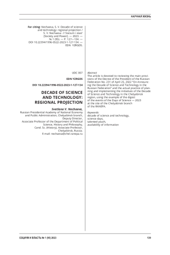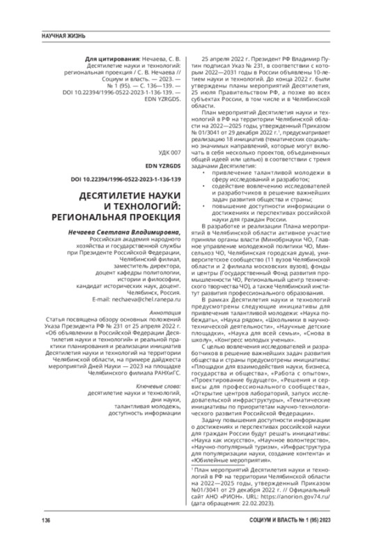 Статья посвящена обзору основных положений Указа Президента РФ № 231 от 25 апреля 2022 г. «Об объявлении в Российской Федерации Десятилетия науки и технологий» и реальной практики планирования и реализации инициатив Десятилетия науки и технологий на территории Челябинской области, на примере дайджеста мероприятий Дней Науки - 2023 на площадке Челябинского филиала РАНХиГС.