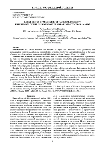 Введение: в статье рассматриваются особенности реализации прав, ограничений, обязанностей и ответственности, установленных советским законодательством в отношении руководителей предприятий народного хозяйства СССР в годы Великой Отечественной войны 1941-1945 гг.