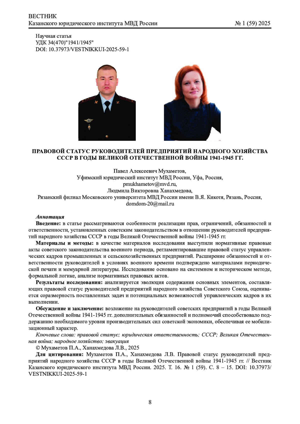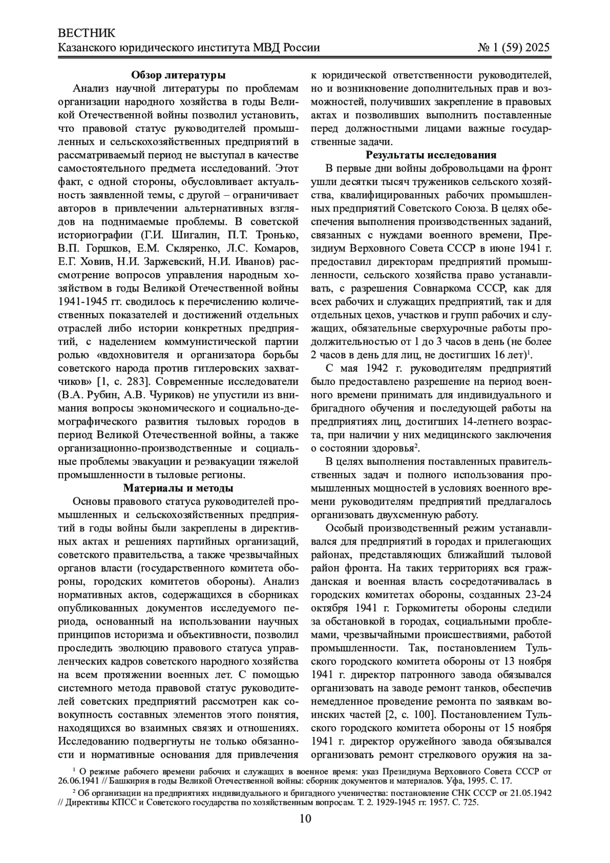 Материалы и методы: в качестве материалов исследования выступили нормативные правовые акты советского законодательства военного периода, регламентировавшие правовой статус управленческих кадров промышленных и сельскохозяйственных предприятий. Расширение обязанностей и ответственности руководителей в условиях военного времени подтверждено материалами периодической печати и мемуарной литературы. Исследование основано на системном и историческом методе, формальной логике, анализе нормативных правовых актов.