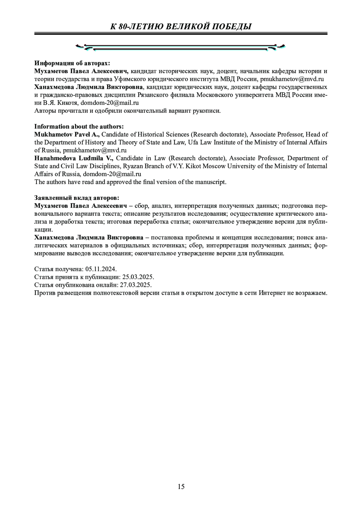 Обсуждение и заключение: анализ опубликованных и неопубликованных источников позволяет авторам по-иному воспринимать отдельные события конца Великой Отечественной войны. Настоящее понимание того исторического периода стало возможным лишь потому, что исследователям стали доступны неизвестные или малоизвестные факты о тех тяжёлых днях, выпавших на долю советского народа.