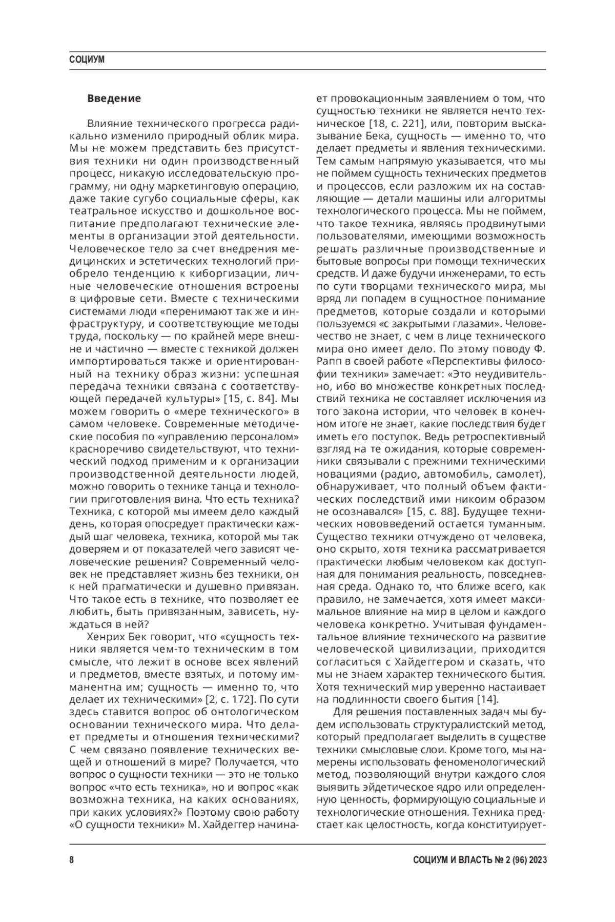 Введение. Универсализм современной техники свидетельствует об определенном режиме ее существования. Он проявляется в том, что нет практически ни одного сегмента современного мира, ни одной сферы культуры, куда бы техника не распространила свое влияние - непосредственное или опосредованное/анонимное. На основе исследования авторы приходят к выводу, что техника одновременно является и традицией, и встроенной в традицию логикой, и реализацией особой бытийной направленности, воплощением особого рода.
