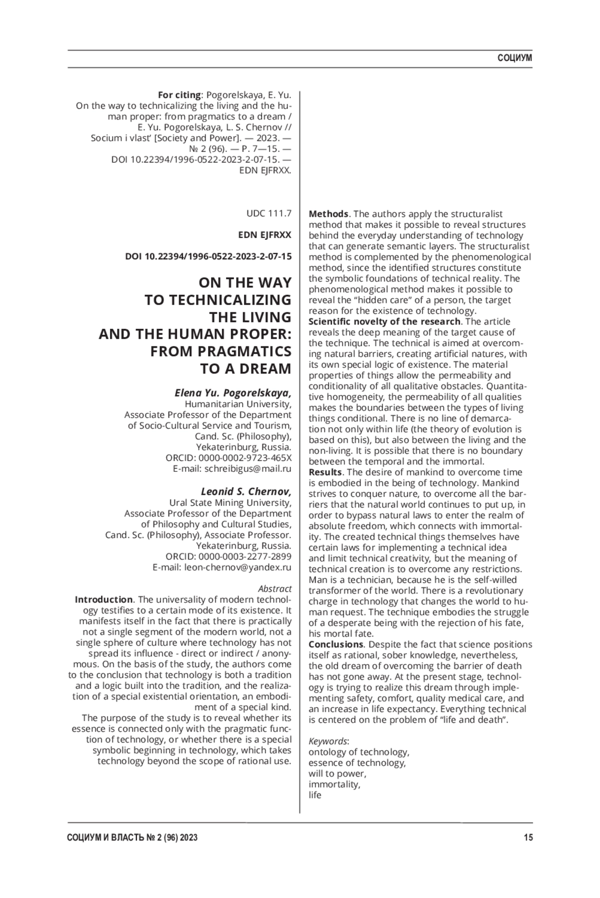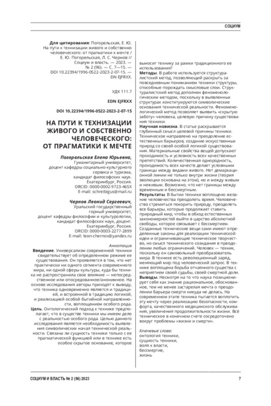 Методы. В работе используется структуралистский метод, позволяющий раскрыть за повседневным пониманием техники структуры, способные порождать смысловые слои. Структуралистский метод дополнен феноменологическим методом, поскольку в выявленных структурах конституируются символические основания технической реальности. Феноменологический метод позволяет выявить «скрытую заботу» человека, целевую причину существования техники. Научная новизна. В статье раскрывается глубинный смысл целевой причины техники. Техническое направлено на преодоление естественных барьеров, создание искусственных природ со своей особой логикой существования. Материальные свойства вещей допускают проходимость и условность всех качественных препятствий. Количественная однородность, проходимость всех качеств делает условными границы между видами живого. Нет демаркационной линии не только внутри жизни (теория эволюции основана на этом), но и между живым и неживым. Возможно, что нет границы между временным и бессмертным.