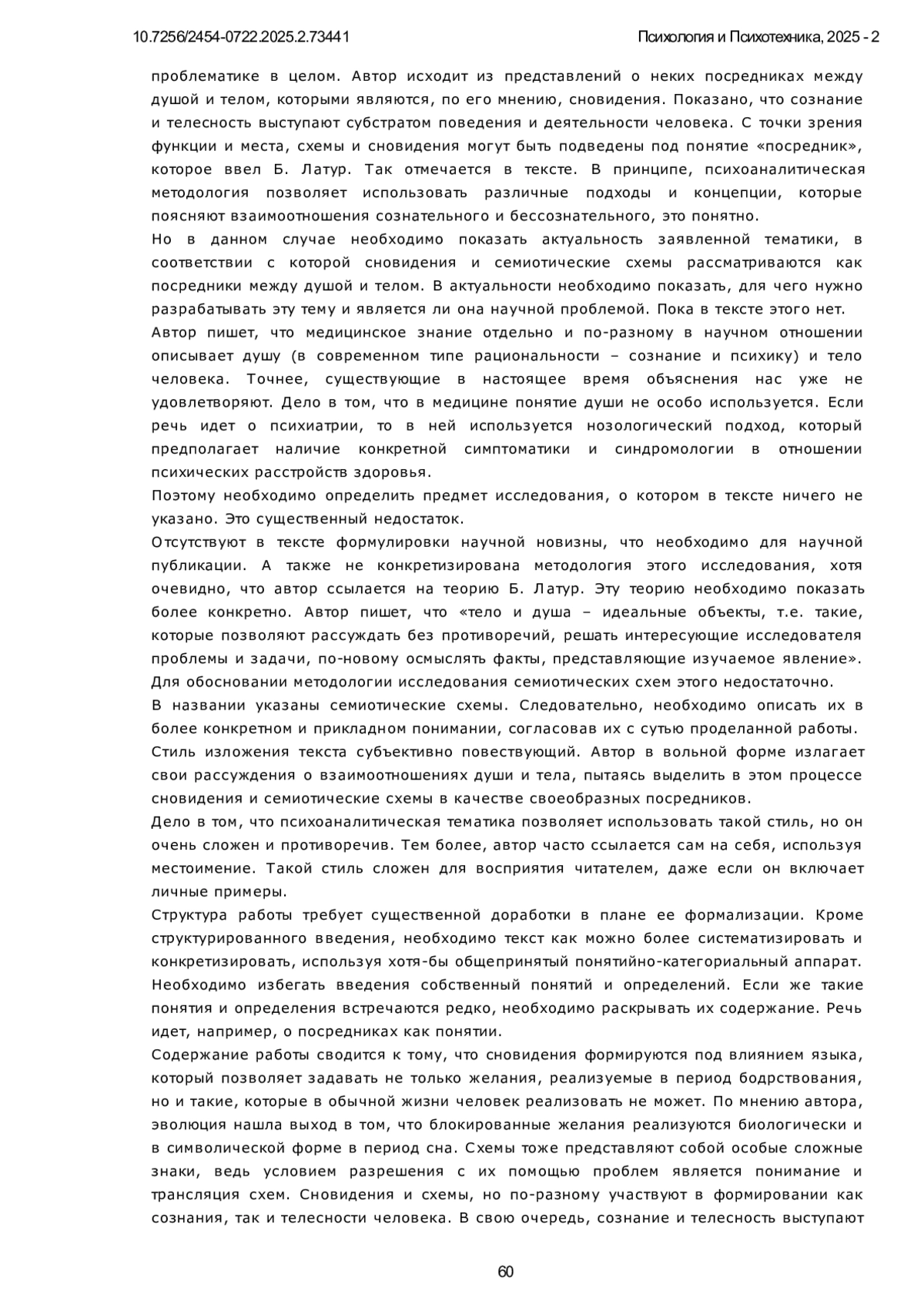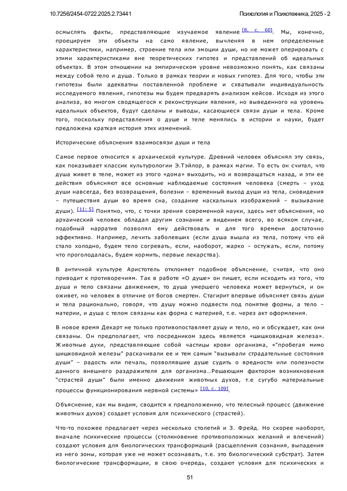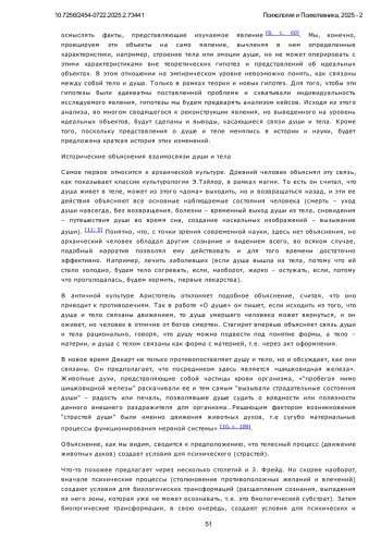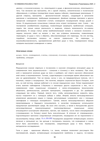 В статье обсуждается еще один вариант связи души и тела. Но сначала автор рассматривает решение этого вопроса в Древнем мире, Аристотелем, Декартом и З. Фрейдом. У Декарта решение сводится к предположению, что телесный процесс (движение животных духов) создает условия для психического (страстей), а у Фрейда вырисовывается более сложная картина: душевные (психические) процессы создают условия для телесных трансформацией, а те, в свою очередь, - для новых душевных изменений. Собственный подход автор основывает на предположении, что между душой и телом в качестве посредников выступают сновидения и семиотические схемы. Для обоснования этого предположения он предлагает реконструкцию и объяснение двух кейсов (детского сновидения автора и подросткового воспоминания К. Юнга). Автор показывает, что все основные процессы, участвующие в построении сновидений, двояки: и психологические, т. е. относящиеся к душе, и физиологические, относящиеся к телу. Так желание как программа, это с одной стороны, семиотическое и психическое образования, в которых посредством языка заданы события, подлежащие реализации. С другой стороны, программа - физиологический процесс, создающий в организме давление и напряжение, требующие разрешения. Двойная природа программ и других процессов сновидения позволяет считать сновидения посредниками между душой и телом. В рациональном осмыслении главную роль играет построение схем. Схема - это построение (изобретение) индивида, позволяющая разрешить проблемную ситуацию, задать тем самым новую реальность и видение, открыть возможность по-новому действовать. В конце статьи автор проблематизирует вопрос о желании психолога и медика получить ответ на вопрос о том, как устроены механизмы, позволяющие переходить от души к телу и обратно, обусловливающие эти переходы. На его взгляд, подобная постановка вопроса не совсем правильная. Не переходы, а взаимообусловленность, одновременное действие души и тела, посредниками между которыми выступают сновидения и схемы.