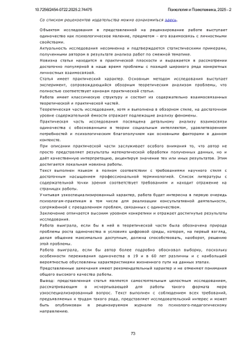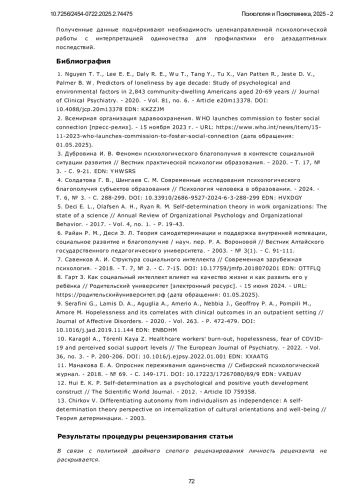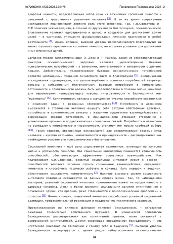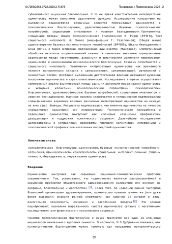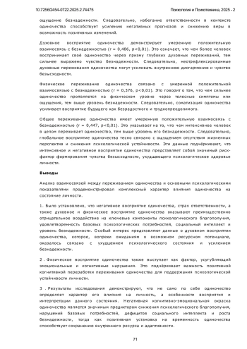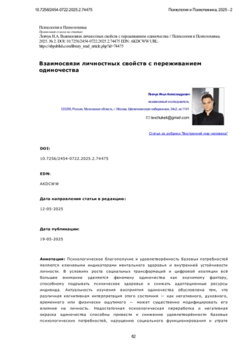 Психологическое благополучие и удовлетворённость базовых потребностей являются ключевыми индикаторами ментального здоровья и внутренней устойчивости личности. В условиях роста социальных трансформаций и цифровой изоляции всё большее внимание уделяется феномену одиночества как значимому фактору, способному подрывать психическое здоровье и снижать адаптационные ресурсы индивида. Актуальность изучения восприятия одиночества обусловлена тем, что различная когнитивная интерпретация этого состояния - как негативного, духовного, временного или физически ощутимого - может существенно модифицировать его влияние на личность. Недостаточная психологическая переработка и негативная окраска одиночества способны привести к снижению удовлетворённости базовых психологических потребностей, нарушению социального функционирования и утрате субъективного ощущения благополучия. В то же время конструктивная интерпретация одиночества может выполнять адаптивную функцию. Исследование направлено на выявление взаимосвязей различных аспектов переживания одиночества с психологическим благополучием, удовлетворенностью базовых психологических потребностей, социальным интеллектом и уровнем безнадежности. Применялись следующие методы: Шкала психологического благополучия К. Рифф (RPWB), Тест социального интеллекта Н. Холла (модификация Г. Резапкиной), Общая шкала удовлетворения базовых психологических потребностей (BPNSS), Шкала безнадежности Бека (BHS), а также Опросник переживания одиночества (Манакова). Статистическая обработка включала корреляционный анализ. Установлены значимые отрицательные взаимосвязи между негативными, духовными и физическими аспектами переживания одиночества и компонентами психологического благополучия, базовых потребностей и социального интеллекта. Позитивная интерпретация одиночества как временного явления положительно связана с самосознанием, самомотивацией, автономией и личностным ростом. Особенно выраженное деструктивное влияние оказывают духовное восприятие одиночества и страх ответственности. Исследование впервые осуществляет комплексный анализ взаимосвязей между разными аспектами переживания одиночества и четырьмя ключевыми психологическими параметрами: психологическим благополучием, удовлетворённостью базовых потребностей, социальным интеллектом и уровнем безнадёжности. Научная новизна заключается в эмпирическом подтверждении специфического характера влияния различных интерпретаций одиночества на каждую из этих сфер. Выводы. Результаты подтверждают, что влияние одиночества на личность определяется характером его интерпретации. Психологическая переработка и переоценка одиночества выступают как ключевые механизмы профилактики дезадаптации и поддержки психического здоровья. Дальнейшие исследования целесообразны в направлении разработки программ когнитивной интервенции и психологической профилактики негативных последствий одиночества.
