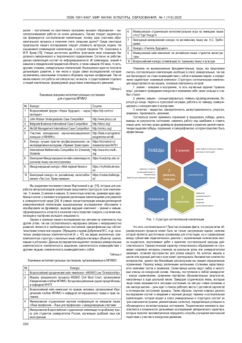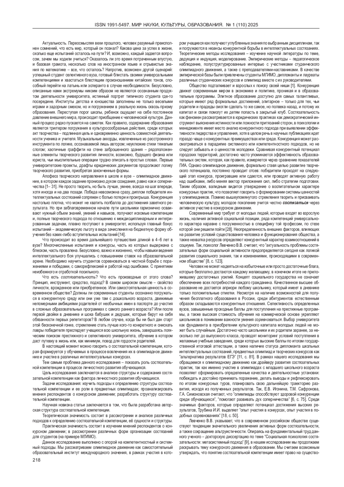 Интеллектуальные состязания прочно вошли в современные образовательные практики, что обуславливает пристальное внимание к ним в рамках компетентностного подхода. Школьники и студенты принимают участие в интеллектуальных соревнованиях по различным дисциплинам, демонстрируя как универсальные компетенции, так и глубокие знания по отдельным трекам. Современное общество характеризуется конкурентным характером взаимоотношений, природа которых кроется как в свойствах личности, так и определяется борьбой за ресурсы. Актуальность нашего исследования преломляется в необходимости осознанного и здорового отношения к состязательным мероприятиям в рамках образовательного процесса в отечественной традиции. В статье рассматривается структура состязательной компетенции, сам термин впервые вводится в научный дискурс педагогической направленности, что составляет научную новизну представленного исследования; цель - обоснование наличия трех компонентов (знания, умения/навыки, качества), которые формируются и развиваются средствами олимпиадного движения. Использованы теоретические методы - анализ научной литературы, моделирование. Среди эмпирических методов - полуструктурированные интервью с дипломантами студенческих олимпиад (10 информантов) и преподавателями-наставниками (7 информантов), представителями Московского государственного института международных отношений Министерства иностранных дел Российской Федерации. Теоретическая значимость преломляется в введении нового термина в педагогическую науку и возможности проведения дальнейших квалиметрических исследований, направленных на повышение эффективности отечественного конкурсного движения.