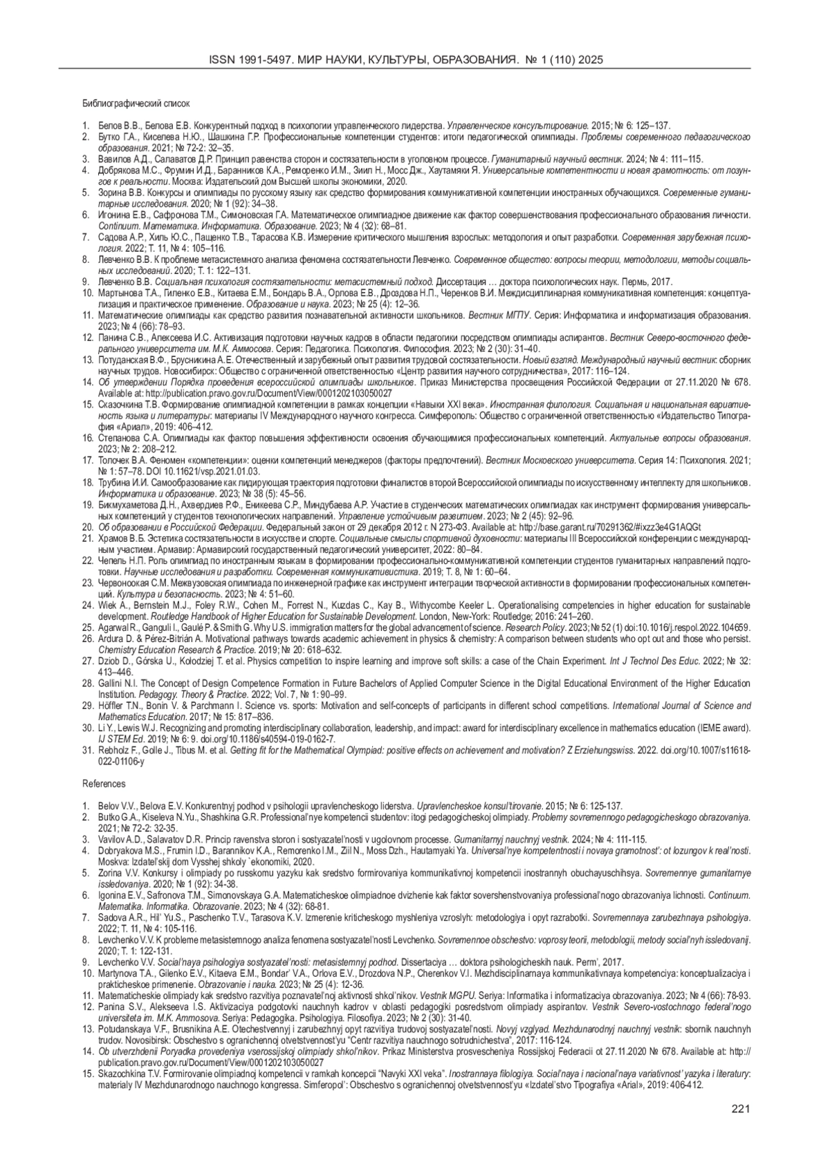 5. 	Зорина В.В. Конкурсы и олимпиады по русскому языку как средство формирования коммуникативной компетенции иностранных обучающихся. Современные гуманитарные исследования. 2020; № 1 (92): 34-38. EDN: JYBPSL