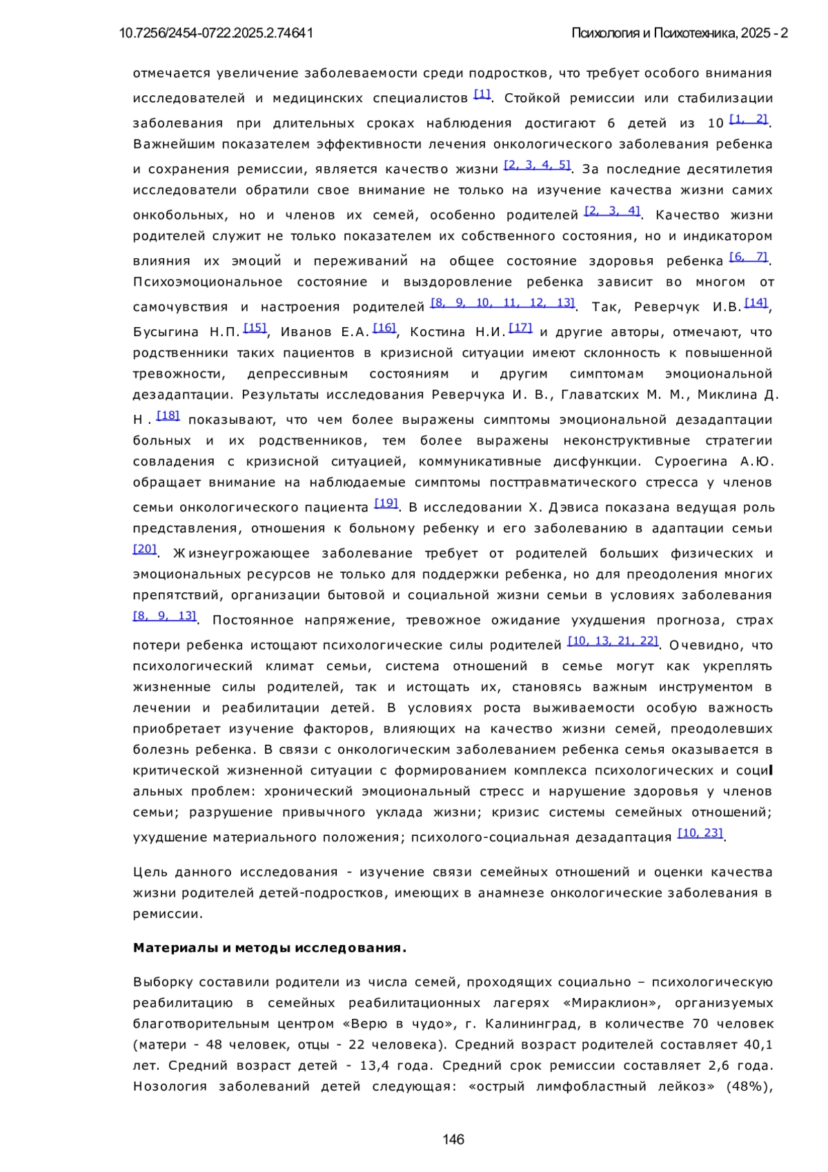 6. Шиловская Н. В., Главатских М. М., Реверчук И. В. Копинг-поведение ближайших родственников онкобольных детей в ремиссии как фактор их качества жизни // Educational Bulletin Consciousness. 2025. Vol. 27, No. 1. P. 11-25. DOI: 10.26787/nydha-2686-6846-2025-27-1-11-25