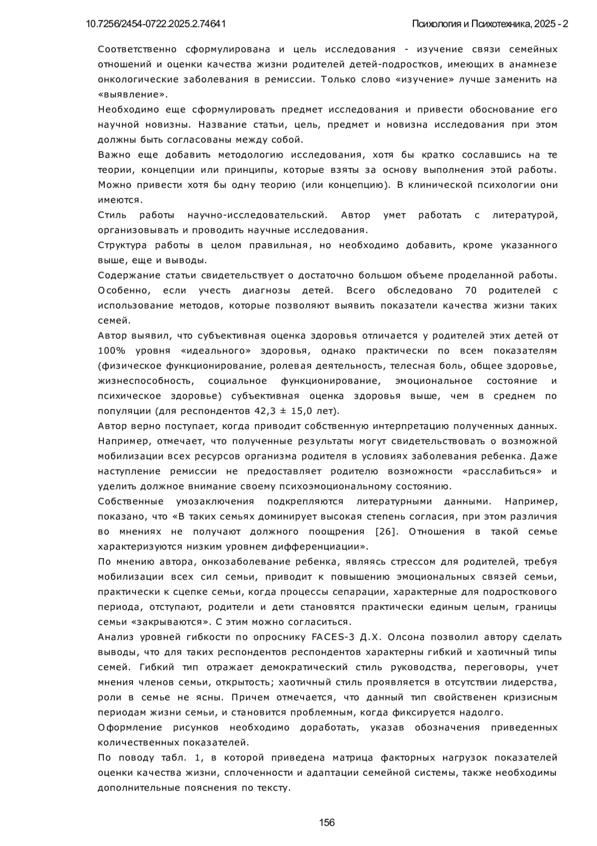 Предмет исследования. Ситуация онкологического заболевания ребенка связана с длительным психоэмоциональным напряжением родителя, которое сохраняется в период выхода заболевания в ремиссию и негативно влияет на качество жизни всех членов семьи. Тревога и беспокойство родителей негативно сказываются на качестве жизни как самого родителя, так и семьи в целом. Качество жизни, наряду с ответом опухоли и безрецидивной выживаемостью, является одним из показателей эффективности лечения детского рака. В статье представлены результаты исследования связи семейных отношений и оценки качества жизни родителей, воспитывающих подростков имеющих в анамнезе онкологические заболевания, находящиеся в ремиссии сроком до 5 лет на момент исследования. В группе родителей подростков (N=70) оценивались показатели качества жизни и семейной адаптации и сплоченности. Использовались опросник качества жизни SF-36 (Medical Outcomes Study - Short Form Health Survey) и шкала семейной адаптации и сплоченности FACES-3. Факторный анализ методом главных компонент позволил выявить 6 факторов семейных отношений, влияющих на жизнеспособность семьи и качество жизни: физическое функционирование (0,567), психическое здоровье (0,688), социальное функционирование (0,571), жизненная активность (0,634), сплоченность (0,730), гибкость (0,607). Впервые исследована связь семейных отношений и качества жизни родителей подростков с онкозаболеваниями в ремиссии. Полученные данные демонстрируют, что семейные отношения родителей подростков характеризуются высокой степенью сплоченности и взаимозависимости, а также гибкостью и некоторой хаотичности в процессе адаптации. Результаты исследования могут быть использованы специалистами в области психологии, медицины и социальной работы для создания программ социально-психологической реабилитации, направленной на улучшение качества жизни не только самого подростка, но и его семьи в целом. В качестве основных направлений психологических интервенций для семей, имеющих детей с онкологическими заболеваниями в ремиссии необходимо рассматривать развитие целеполагания, внутренних опор родителей и семьи в целом.