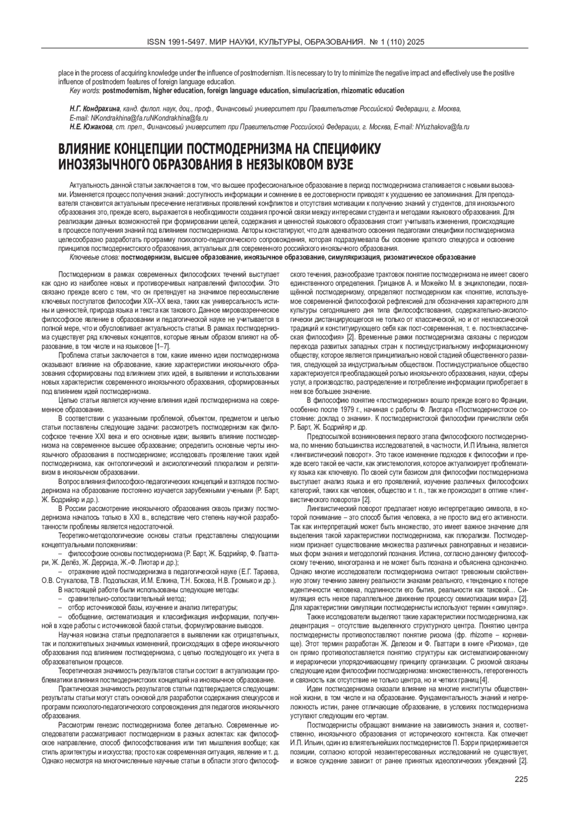 Актуальность данной статьи заключается в том, что высшее профессиональное образование в период постмодернизма сталкивается с новыми вызовами. Изменяется процесс получения знаний: доступность информации и сомнение в ее достоверности приводят к ухудшению ее запоминания. Для преподавателя становится актуальным пресечение негативных проявлений конфликтов и отсутствия мотивации к получению знаний у студентов, для иноязычного образования это, прежде всего, выражается в необходимости создания прочной связи между интересами студента и методами языкового образования. Для реализации данных возможностей при формировании целей, содержания и ценностей языкового образования стоит учитывать изменения, происходящие в процессе получения знаний под влиянием постмодернизма. Авторы констатируют, что для адекватного освоения педагогами специфики постмодернизма целесообразно разработать программу психолого-педагогического сопровождения, которая подразумевала бы освоение краткого спецкурса и освоение принципов постмодернистского образования, актуальных для современного российского иноязычного образования.