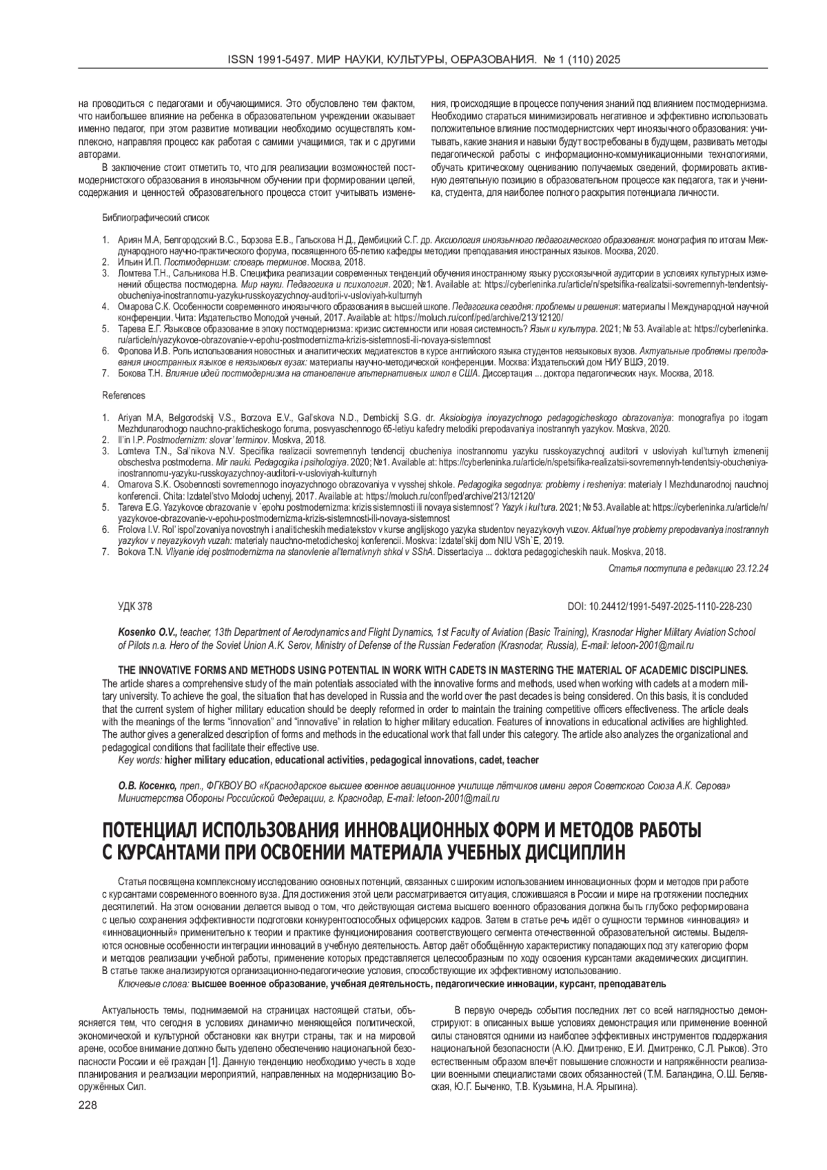 Статья посвящена комплексному исследованию основных потенций, связанных с широким использованием инновационных форм и методов при работе с курсантами современного военного вуза. Для достижения этой цели рассматривается ситуация, сложившаяся в России и мире на протяжении последних десятилетий. На этом основании делается вывод о том, что действующая система высшего военного образования должна быть глубоко реформирована с целью сохранения эффективности подготовки конкурентоспособных офицерских кадров. Затем в статье речь идёт о сущности терминов «инновация» и «инновационный» применительно к теории и практике функционирования соответствующего сегмента отечественной образовательной системы. Выделяются основные особенности интеграции инноваций в учебную деятельность. Автор даёт обобщённую характеристику попадающих под эту категорию форм и методов реализации учебной работы, применение которых представляется целесообразным по ходу освоения курсантами академических дисциплин. В статье также анализируются организационно-педагогические условия, способствующие их эффективному использованию.