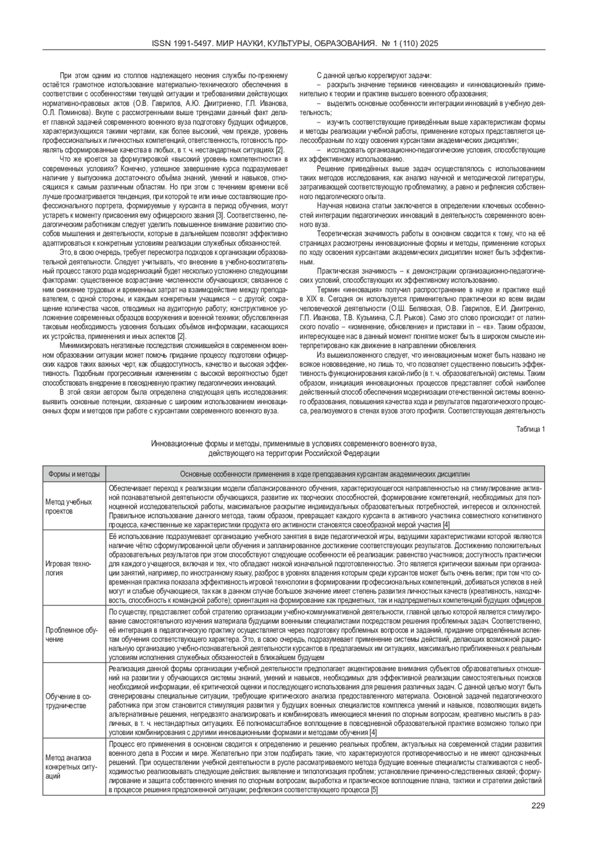 Статья посвящена комплексному исследованию основных потенций, связанных с широким использованием инновационных форм и методов при работе с курсантами современного военного вуза. Для достижения этой цели рассматривается ситуация, сложившаяся в России и мире на протяжении последних десятилетий. На этом основании делается вывод о том, что действующая система высшего военного образования должна быть глубоко реформирована с целью сохранения эффективности подготовки конкурентоспособных офицерских кадров. Затем в статье речь идёт о сущности терминов «инновация» и «инновационный» применительно к теории и практике функционирования соответствующего сегмента отечественной образовательной системы. Выделяются основные особенности интеграции инноваций в учебную деятельность. Автор даёт обобщённую характеристику попадающих под эту категорию форм и методов реализации учебной работы, применение которых представляется целесообразным по ходу освоения курсантами академических дисциплин. В статье также анализируются организационно-педагогические условия, способствующие их эффективному использованию.
