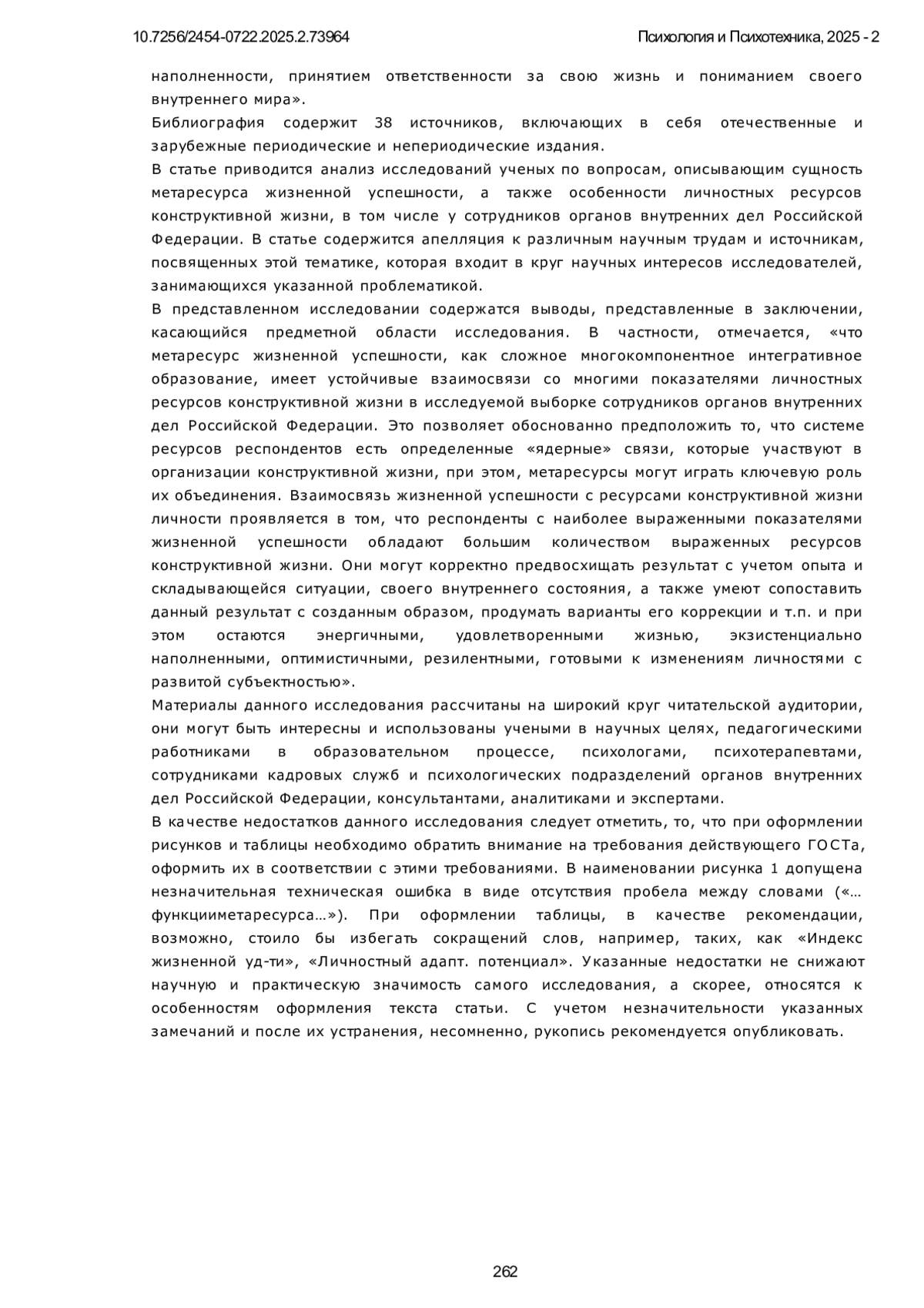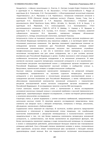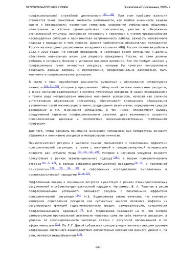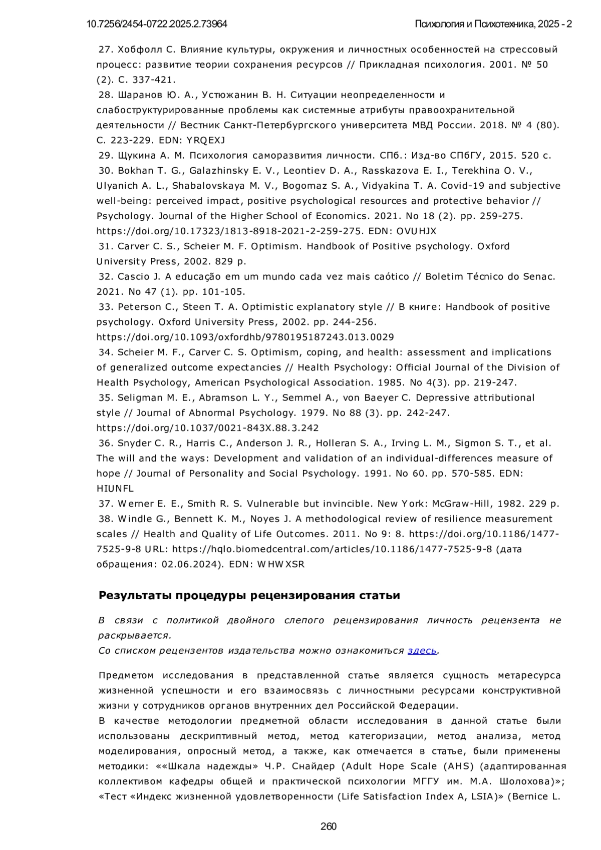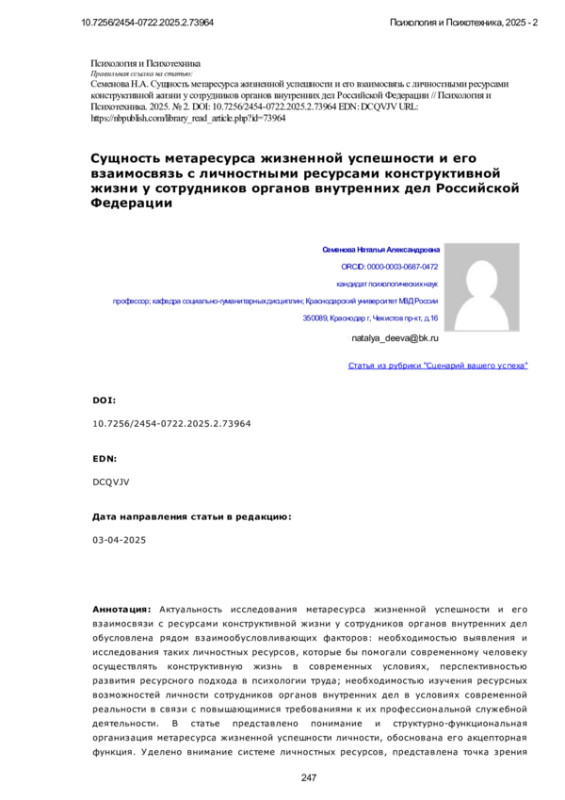 23. Семенова Н. А. Жизненная успешность личности сотрудников органов внутренних дел Российской Федерации: концептуальное обоснование и структурно-функциональная организация // Прикладная психология и педагогика. 2024. Т. 9. № 2. С. 64-81. DOI: 10.12737/2500-0543-2024-9-2-64-81