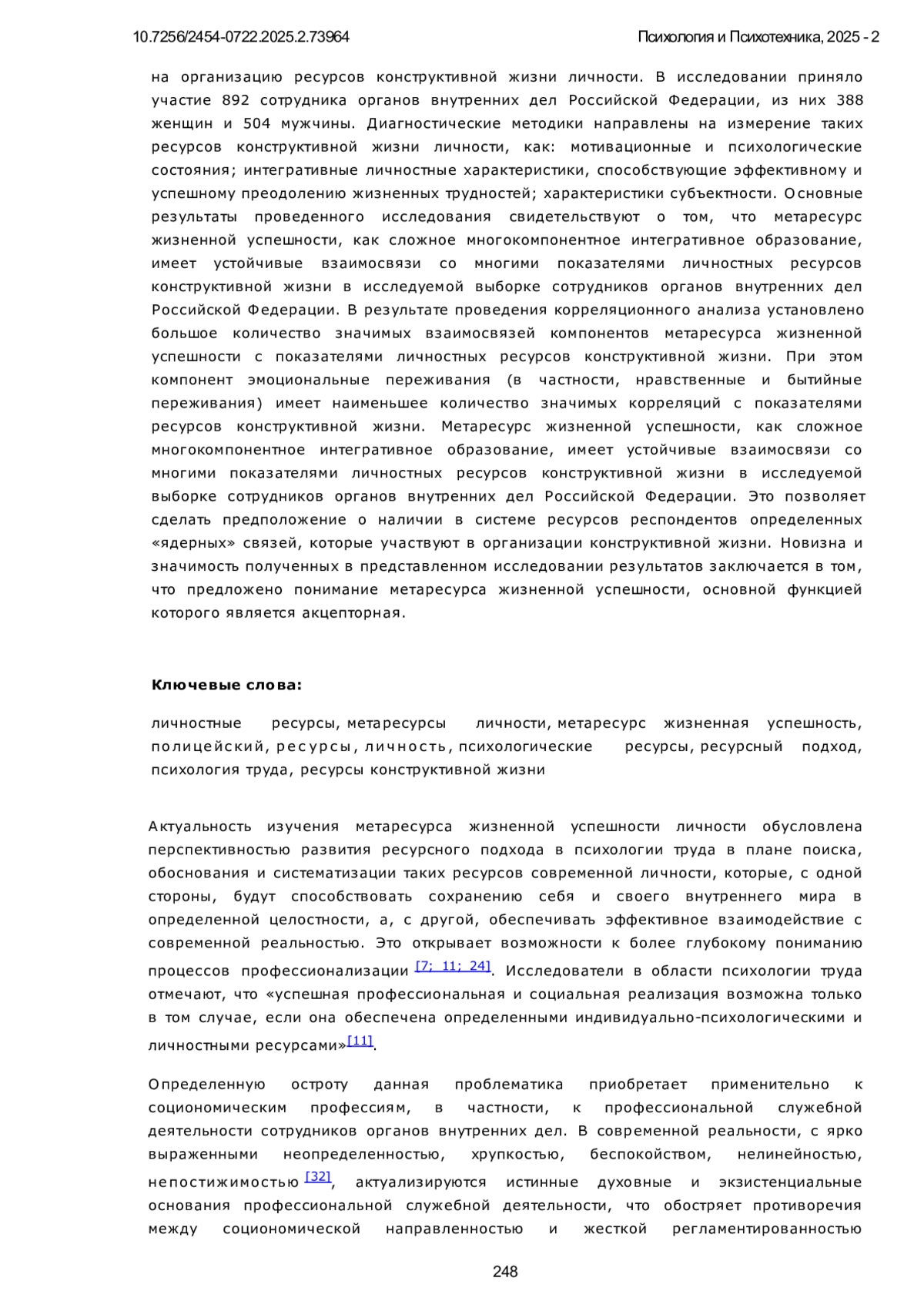 Актуальность исследования метаресурса жизненной успешности и его взаимосвязи с ресурсами конструктивной жизни у сотрудников органов внутренних дел обусловлена рядом взаимообусловливающих факторов: необходимостью выявления и исследования таких личностных ресурсов, которые бы помогали современному человеку осуществлять конструктивную жизнь в современных условиях, перспективностью развития ресурсного подхода в психологии труда; необходимостью изучения ресурсных возможностей личности сотрудников органов внутренних дел в условиях современной реальности в связи с повышающимися требованиями к их профессиональной служебной деятельности. В статье представлено понимание и структурно-функциональная организация метаресурса жизненной успешности личности, обоснована его акцепторная функция. Уделено внимание системе личностных ресурсов, представлена точка зрения на организацию ресурсов конструктивной жизни личности. В исследовании приняло участие 892 сотрудника органов внутренних дел Российской Федерации, из них 388 женщин и 504 мужчины. Диагностические методики направлены на измерение таких ресурсов конструктивной жизни личности, как: мотивационные и психологические состояния; интегративные личностные характеристики, способствующие эффективному и успешному преодолению жизненных трудностей; характеристики субъектности. Основные результаты проведенного исследования свидетельствуют о том, что метаресурс жизненной успешности, как сложное многокомпонентное интегративное образование, имеет устойчивые взаимосвязи со многими показателями личностных ресурсов конструктивной жизни в исследуемой выборке сотрудников органов внутренних дел Российской Федерации. В результате проведения корреляционного анализа установлено большое количество значимых взаимосвязей компонентов метаресурса жизненной успешности с показателями личностных ресурсов конструктивной жизни. При этом компонент эмоциональные переживания (в частности, нравственные и бытийные переживания) имеет наименьшее количество значимых корреляций с показателями ресурсов конструктивной жизни. Метаресурс жизненной успешности, как сложное многокомпонентное интегративное образование, имеет устойчивые взаимосвязи со многими показателями личностных ресурсов конструктивной жизни в исследуемой выборке сотрудников органов внутренних дел Российской Федерации. Это позволяет сделать предположение о наличии в системе ресурсов респондентов определенных «ядерных» связей, которые участвуют в организации конструктивной жизни. Новизна и значимость полученных в представленном исследовании результатов заключается в том, что предложено понимание метаресурса жизненной успешности, основной функцией которого является акцепторная.