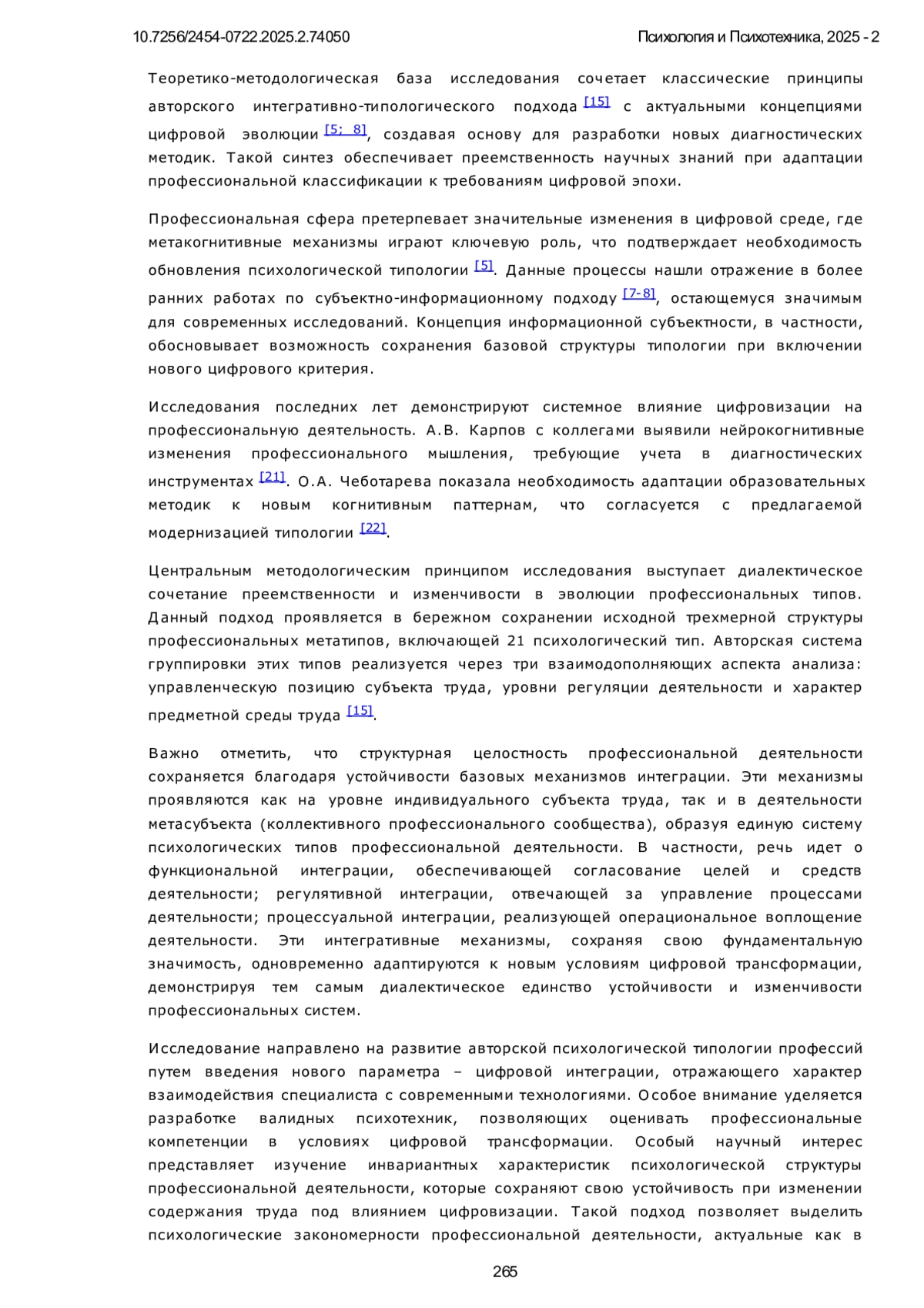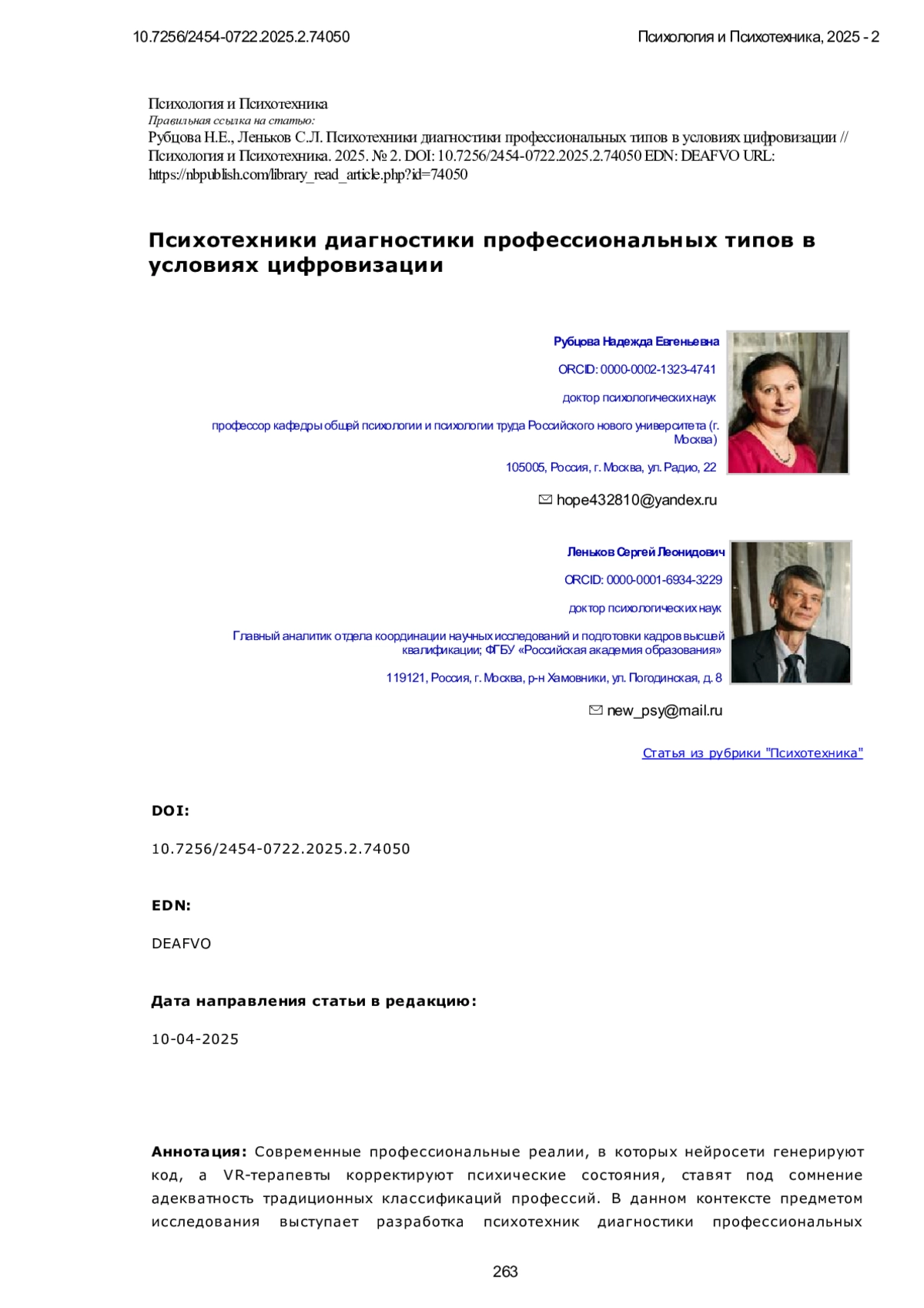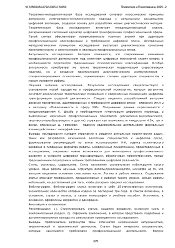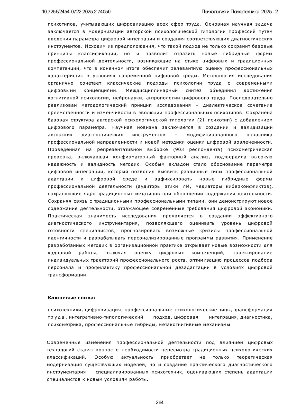 Современные профессиональные реалии, в которых нейросети генерируют код, а VR-терапевты корректируют психические состояния, ставят под сомнение адекватность традиционных классификаций профессий. В данном контексте предметом исследования выступает разработка психотехник диагностики профессиональных психотипов, учитывающих цифровизацию всех сфер труда. Основная научная задача заключается в модернизации авторской психологической типологии профессий путем введения параметра цифровой интеграции и создания соответствующих диагностических инструментов. Исходим из предположения, что такой подход не только сохранит базовые принципы классификации, но и позволит отразить новые гибридные формы профессиональной деятельности, возникающие на стыке цифровых и традиционных компетенций, что в конечном итоге обеспечит релевантную оценку профессиональных характеристик в условиях современной цифровой среды. Методология исследования органично сочетает классические подходы психологии труда с современными цифровыми концепциями. Междисциплинарный синтез объединил достижения когнитивной психологии, нейронауки, антропологии цифрового труда. Последовательно реализован методологический принцип исследования - диалектическое сочетание преемственности и изменчивости в эволюции профессиональных психотипов. Сохранена базовая структура авторской психологической типологии (21 психотип) с добавлением цифрового параметра. Научная новизна заключается в создании и валидизации авторских диагностических инструментов - модифицированного опросника профессиональной направленности и новой методики оценки цифровой вовлеченности. Проведенная на репрезентативной выборке (903 респондента) психометрическая проверка, включавшая конфирматорный факторный анализ, подтвердила высокую надежность и валидность методик. Особым вкладом стало обоснование параметра цифровой интеграции, который позволил выявить различные типы профессиональной адаптации к цифровой среде и зафиксировать новые гибридные формы профессиональной деятельности (аудиторы этики ИИ, медиаторы киберконфликтов), сохраняющие ядро традиционных метатипов при обновлении содержания деятельности. Сохраняя связь с традиционными профессиональными типами, они демонстрируют новое содержание деятельности, отражающее современные требования цифровой экономики. Практическая значимость исследования проявляется в создании эффективного диагностического инструментария, позволяющего оценивать уровень цифровой готовности специалистов, прогнозировать возможные кризисы профессиональной идентичности и разрабатывать персонализированные программы развития. Применение разработанных методик в организационной практике открывает новые возможности для кадровой работы, включая оценку цифровых компетенций, проектирование индивидуальных траекторий профессионального роста, оптимизацию процессов подбора персонала и профилактику профессиональной дезадаптации в условиях цифровой трансформации