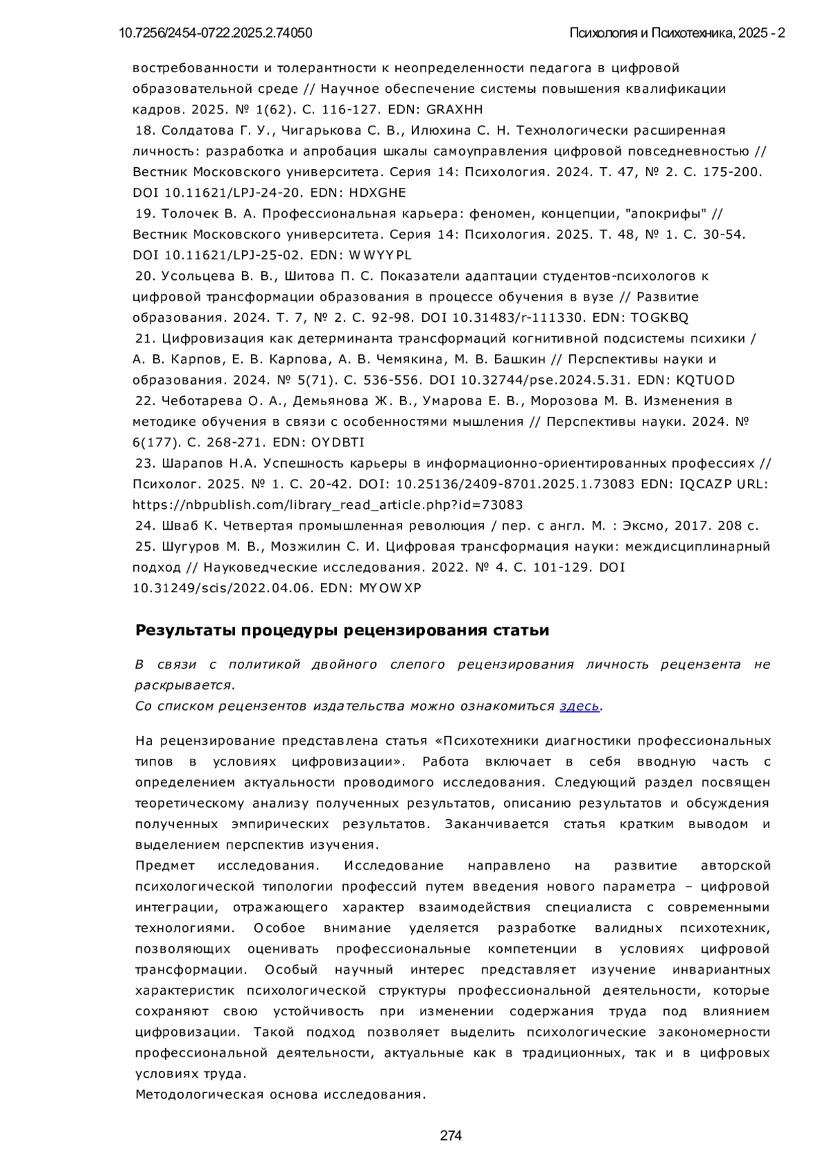23. Шарапов Н.А. Успешность карьеры в информационно-ориентированных профессиях // Психолог. 2025. № 1. С. 20-42. URL: https://nbpublish.com/library_read_article.php?id=73083. DOI: 10.25136/2409-8701.2025.1.73083