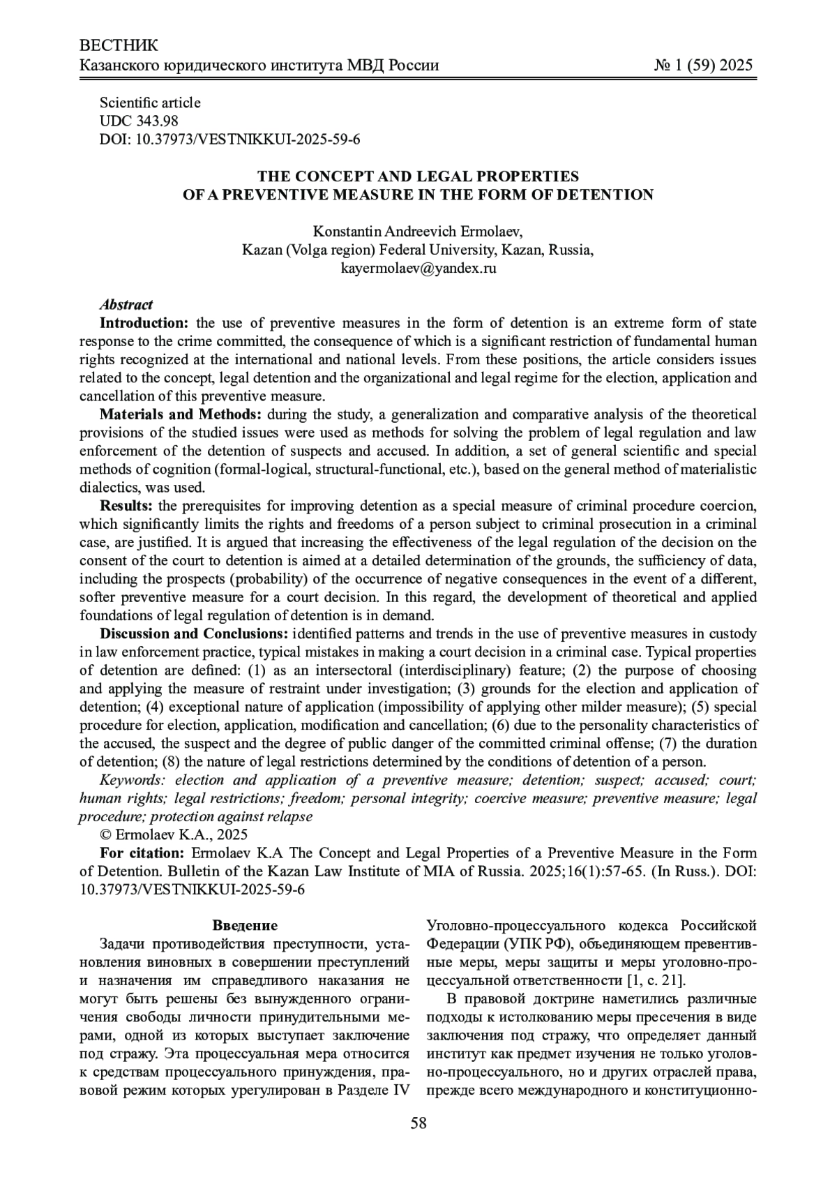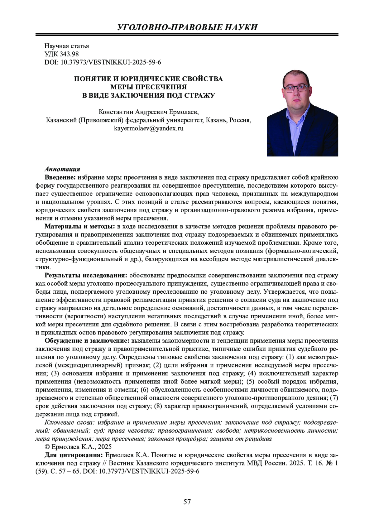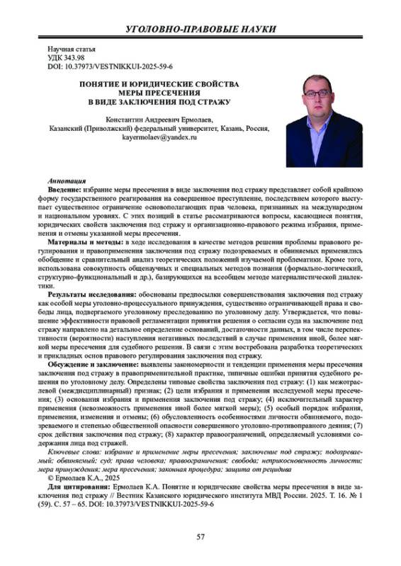 Введение: избрание меры пресечения в виде заключения под стражу представляет собой крайнюю форму государственного реагирования на совершенное преступление, последствием которого выступает существенное ограничение основополагающих прав человека, признанных на международном и национальном уровнях. С этих позиций в статье рассматриваются вопросы, касающиеся понятия, юридических свойств заключения под стражу и организационно-правового режима избрания, применения и отмены указанной меры пресечения.