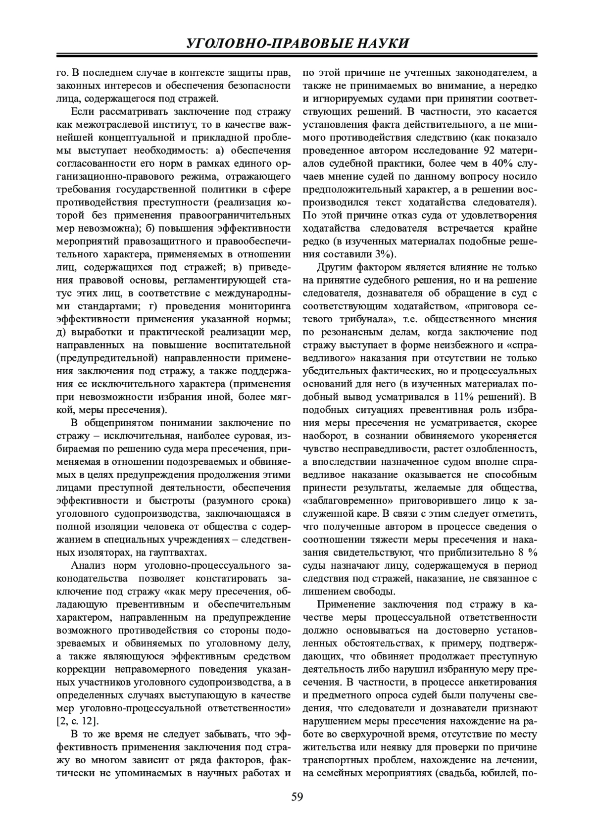 Задачи противодействия преступности, установления виновных в совершении преступлений и назначения им справедливого наказания не могут быть решены без вынужденного ограничения свободы личности принудительными мерами, одной из которых выступает заключение под стражу. Эта процессуальная мера относится к средствам процессуального принуждения, правовой режим которых урегулирован в Разделе IV Уголовно-процессуального кодекса Российской Федерации (УПК РФ), объединяющем превентивные меры, меры защиты и меры уголовно-процессуальной ответственности [1, с. 21].