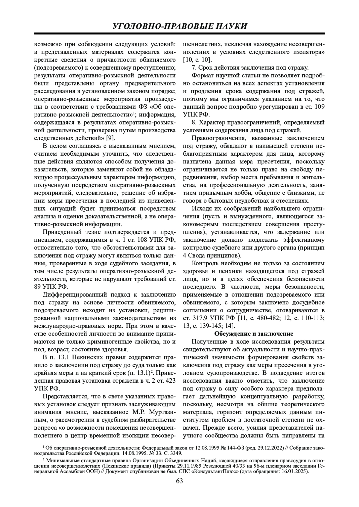 Материалы и методы: в ходе исследования в качестве методов решения проблемы правового регулирования и правоприменения заключения под стражу подозреваемых и обвиняемых применялись обобщение и сравнительный анализ теоретических положений изучаемой проблематики. Кроме того, использована совокупность общенаучных и специальных методов познания (формально-логический, структурно-функциональный и др.), базирующихся на всеобщем методе материалистической диалектики.