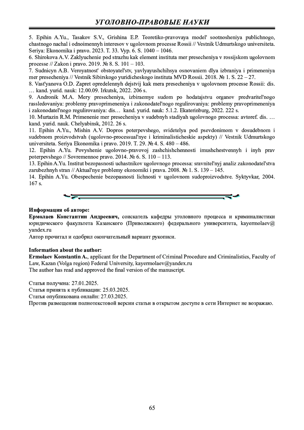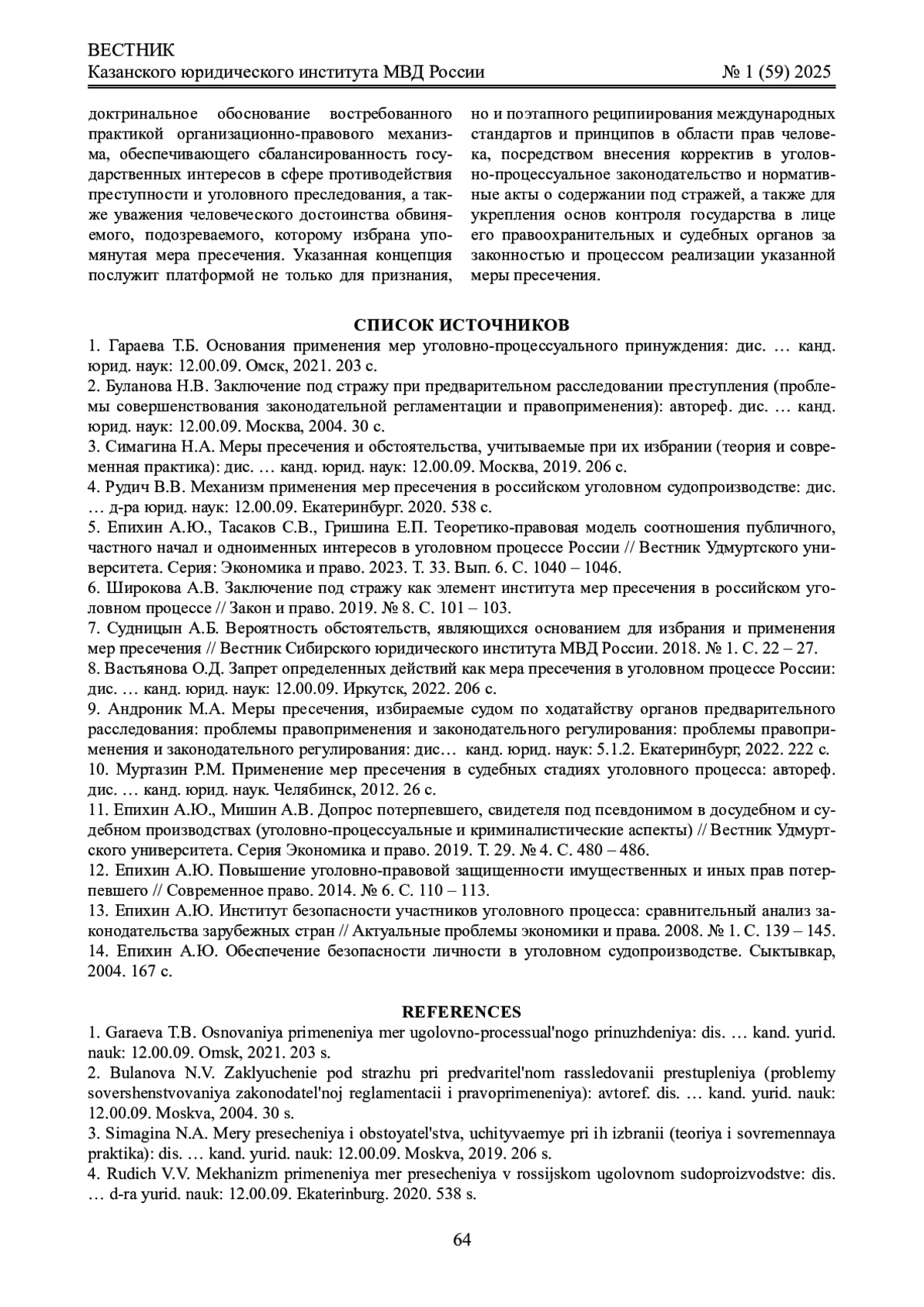 4. 	Рудич В.В. Механизм применения мер пресечения в российском уголовном судопроизводстве: дис. … д-ра юрид. наук: 12.00.09. Екатеринбург. 2020. 538 с. EDN: EHRIFE