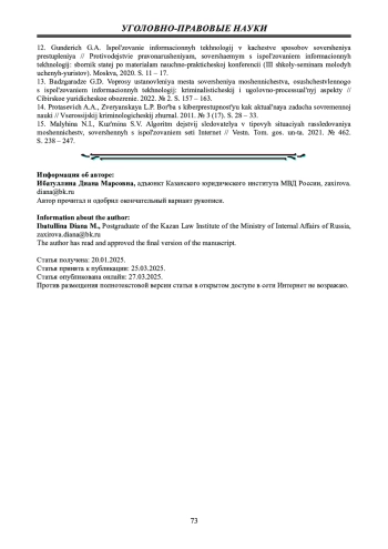12. 	Гундерич Г.А. Использование информационных технологий в качестве способов совершения преступления // Противодействие правонарушениям, совершаемым с использованием информационных технологий: сборник статей по материалам научно-практической конференции (III школы-семинара молодых ученых-юристов). Москва, 2020. С. 11 - 17. EDN: FCJJWG