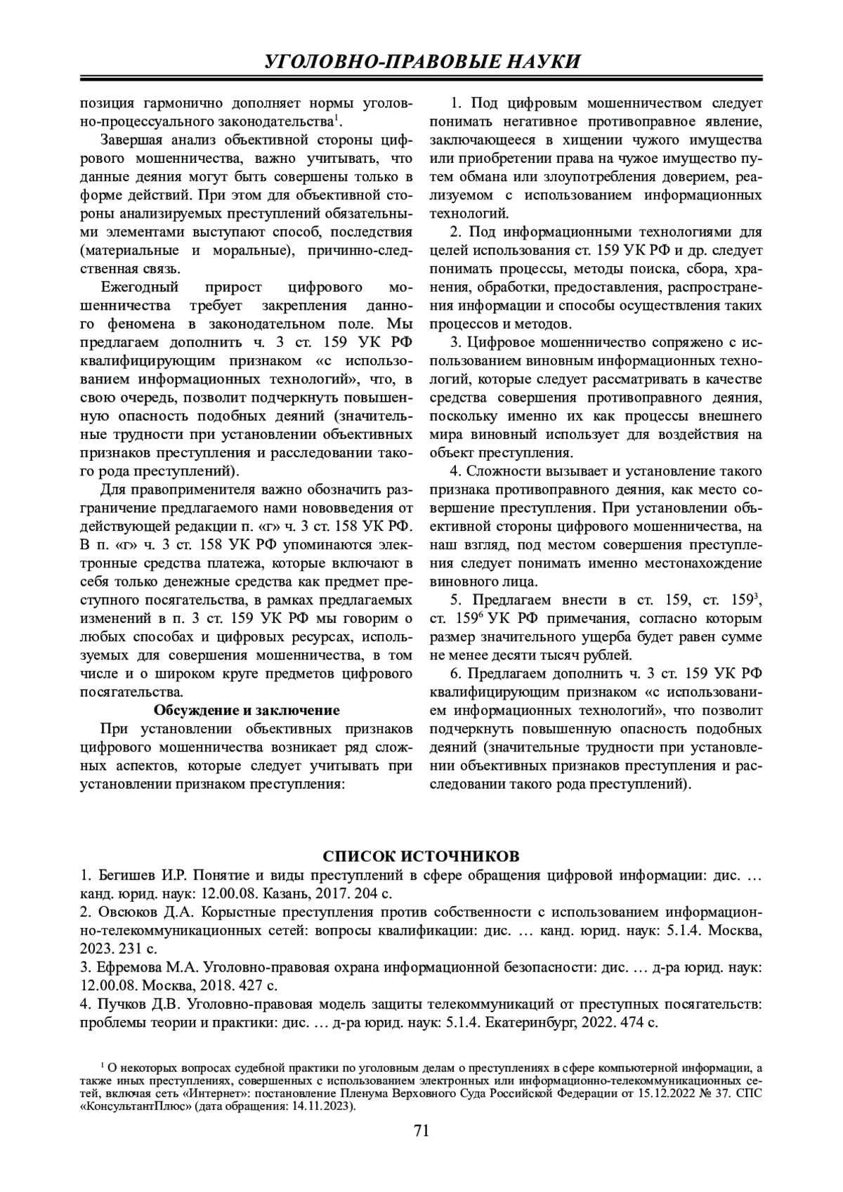 2. 	Овсюков Д.А. Корыстные преступления против собственности с использованием информационно-телекоммуникационных сетей: вопросы квалификации: дис. … канд. юрид. наук: 5.1.4. Москва, 2023. 231 с. EDN: VWVWWE