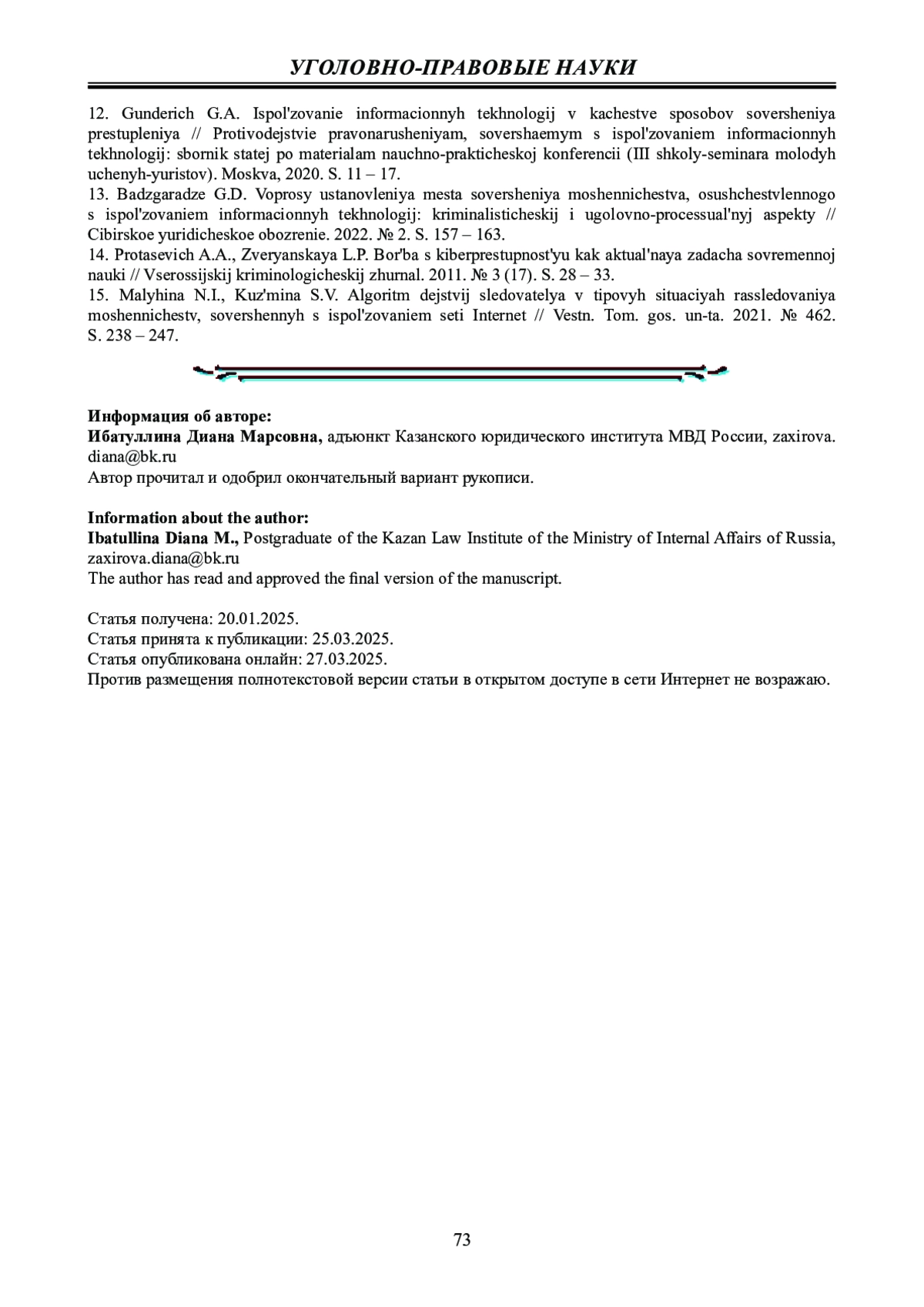 13. 	Бадзгарадзе Г.Д. Вопросы установления места совершения мошенничества, осуществленного с использованием информационных технологий: криминалистический и уголовно-процессуальный аспекты // Cибирское юридическое обозрение. 2022. № 2. С. 157 - 163.