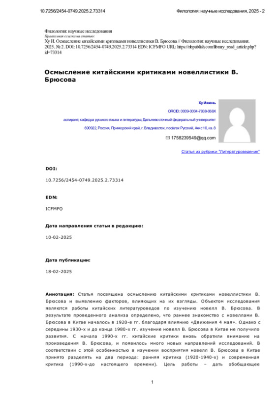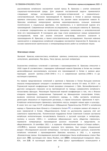 24. 	У Цифан. Три общих темы в творчестве В. Брюсова и Ф. Достоевского // Русская литератураи искусство. 2023. № 2. С. 126-136. 吴起芳. 勃留索夫与陀思妥耶夫斯基的三重对话[J].俄罗斯文艺,2023(02):126-136.