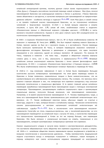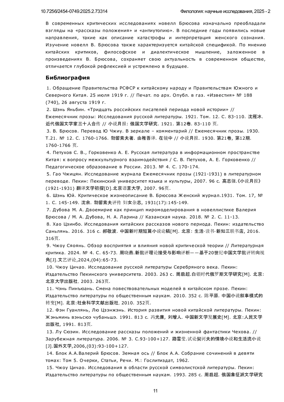 27. 	Цзян Сыюй. Исследование женского сознания в рассказе Брюсова “Под старым мостом” // Цзинь Гу Вэнь Чуан, 2023. № 38. С.7-9. 姜思雨. 勃留索夫短篇小说《老桥下》的女性意识解读[J].今古文创,2023(38):7-9.