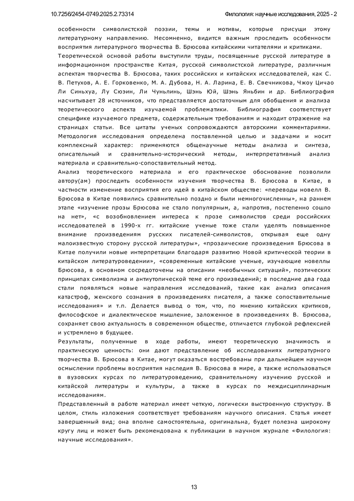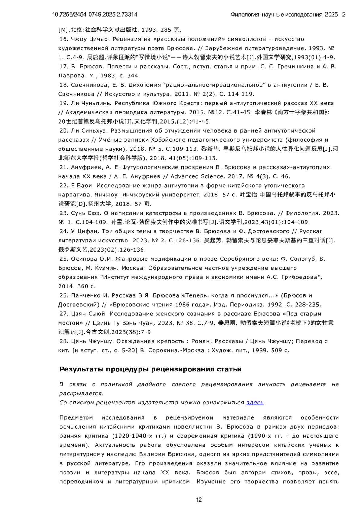 23. 	Сунь Сюэ. О написании катастрофы в произведениях В. Брюсова. // Филология. 2023. № 1. С. 104-109. 孙雪.论瓦·勃留索夫创作中的灾难书写[J].语文学刊,2023,43(01):104-109.