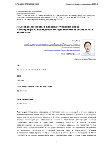 Предметом исследования является система номинаций и титулов героев в древнеанглийском эпосе «Беовульф» как отражение языковой личности и культурных концептов англосаксонского общества. Особое внимание уделяется анализу обширной системы номинаций для обозначения воинов и правителей, отражающей сложную социальную иерархию и ценностные ориентиры общества. В работе детально рассматриваются номинации, связанные с институтом дарения, что позволяет глубже понять социальные механизмы и культурные концепты эпохи. Исследование направлено на выявление особенностей языковой картины мира и социальной структуры англосаксов через призму системы номинаций в эпосе. Данное исследование также стремится к раскрытию взаимосвязи между лингвистическими особенностями номинаций и их культурно-историческим контекстом, что способствует более глубокому пониманию англосаксонского общества и его литературных традиций. Методология исследования включает лингвокультурологический и концептуальный анализ, а также элементы исторического и сравнительного языкознания. Применяется комплексный подход к анализу номинаций с точки зрения отражения в них языковой личности и культурных концептов. Основными выводами проведенного исследования являются выявление обширной системы номинаций в эпосе «Беовульф», отражающей сложную социальную иерархию и ценностные ориентиры англосаксонского общества, а также установление связи между номинациями и институтом дарения. Особым вкладом автора в исследование темы является комплексный анализ номинаций героев, позволивший выявить глубинные связи между языковыми структурами и социокультурными реалиями англосаксонского общества. Новизна исследования заключается в интеграции методов лингвистического анализа с культурологическим и историческим подходами, что предоставило новый взгляд на взаимосвязь языка, культуры и социальной структуры в контексте древнеанглийского эпоса. Результаты работы вносят значительный вклад в области исторического языкознания, культурологии, литературоведения и социальной антропологии, предоставляя новый взгляд на взаимосвязь языка, культуры и социальной структуры в контексте древнеанглийского эпоса. Анализ номинаций в «Беовульфе» позволил выявить глубинные связи между языковыми структурами и социокультурными реалиями англосаксонского общества.