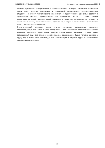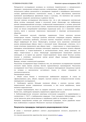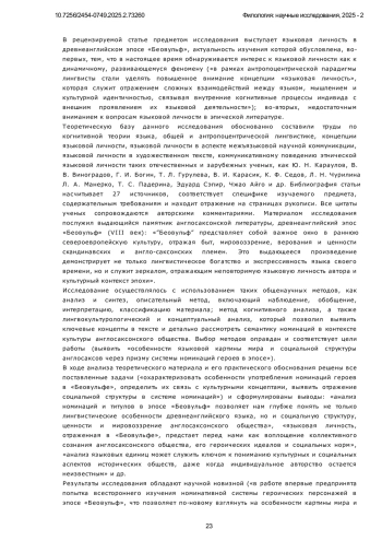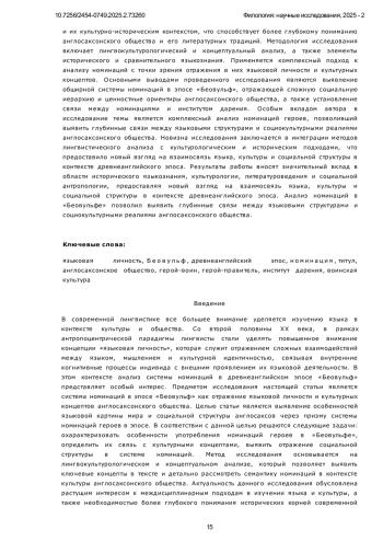 В современной лингвистике все большее внимание уделяется изучению языка в контексте культуры и общества. Со второй половины XX века, в рамках антропоцентрической парадигмы лингвисты стали уделять повышенное внимание концепции «языковая личность», которая служит отражением сложных взаимодействий между языком, мышлением и культурной идентичностью, связывая внутренние когнитивные процессы индивида с внешним проявлением их языковой деятельности. В этом контексте анализ системы номинаций в древнеанглийском эпосе «Беовульф» представляет особый интерес. Предметом исследования настоящей статьи является система номинаций в эпосе «Беовульф» как отражение языковой личности и культурных концептов англосаксонского общества.