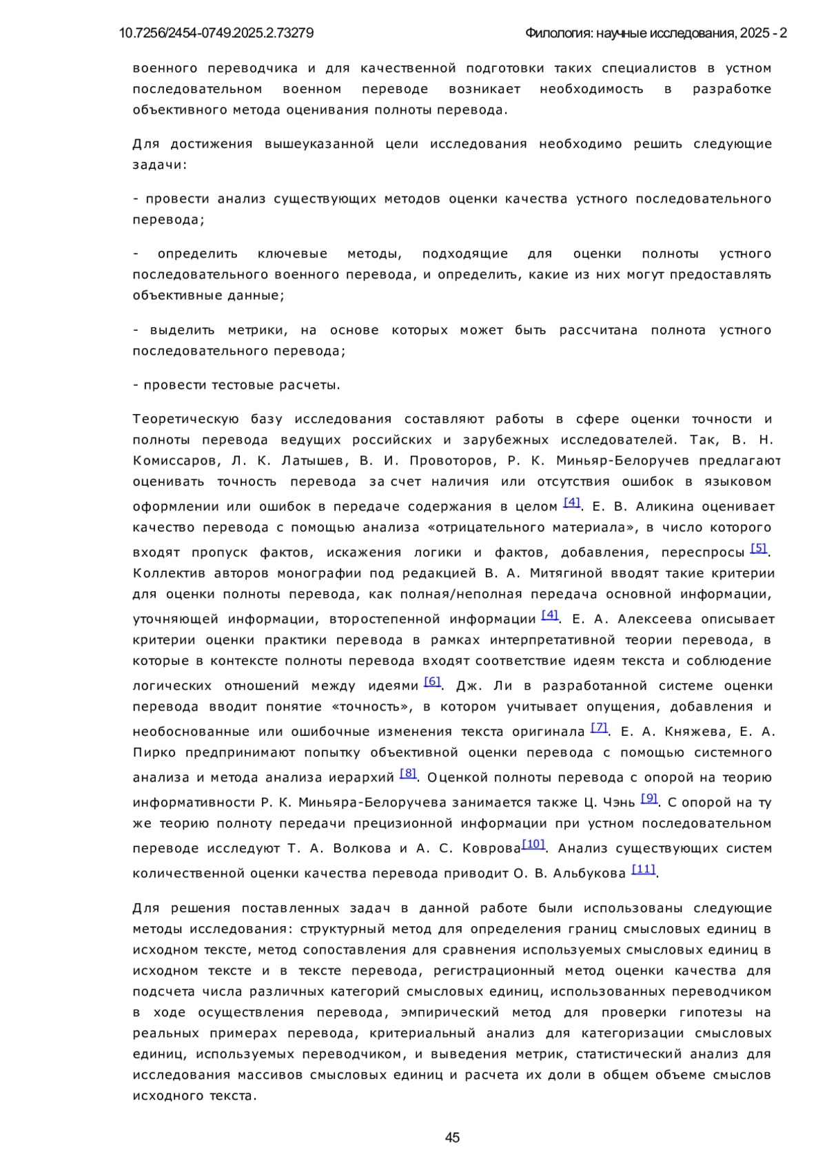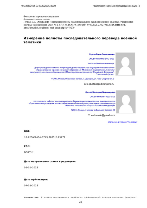 В статье рассмотрена проблема эффективной оценки качества (полноты) устного последовательного перевода, что особенно актуально в сфере военного перевода ввиду необходимости достижения максимальной тождественности текста перевода оригинальному сообщению военной тематики. Авторы делают акцент, что для оценки квалификации военного переводчика и для качественной подготовки таких специалистов в устном последовательном военном переводе возникает необходимость в разработке объективного метода оценивания полноты перевода. Соответственно, такая оценка качества перевода должна в минимальной степени зависеть от человеческого фактора (так называемой экспертной оценки) и более опираться на математические (количественные) методы оценивания качества. Целью данного исследования является разработка методологии объективной оценки полноты переводимой информации при устном последовательном военном переводе. Методология исследования состоит из четырех этапов: 1) проведение анализа существующих методов оценки качества последовательного перевода; 2) определение ключевых методов оценки полноты последовательного военного перевода, которые могут предоставлять объективные данные; 3) выделение метрик для расчета полноты последовательного перевода; 4) проведение тестовых расчетов. Научная новизна исследования состоит в том, что предлагается методика проведения количественной оценки смыслового содержания перевода в сравнении со смысловым содержанием текста оригинального высказывания с помощью подсчета пропозиций в каждом из текстов и проведения анализа результатов. Качество устного перевода с точки зрения его полноты оценивается за счет получения таких данных, как доля (процентного соотношение) точно переведенной информации, доля отступлений от оригинального смысла высказывания, доля искажений смысла и доля необоснованных дополнений - смыслов, не входящих в оригинальное сообщение, но использованных в тексте перевода. Результатом исследования является разработанный метод количественной оценки полноты переводимой информации при устном последовательном военном переводе, который дает практически исчерпывающую информацию о полноте осуществляемого перевода и может быть использован для оценки квалификации переводчика и качества перевода.