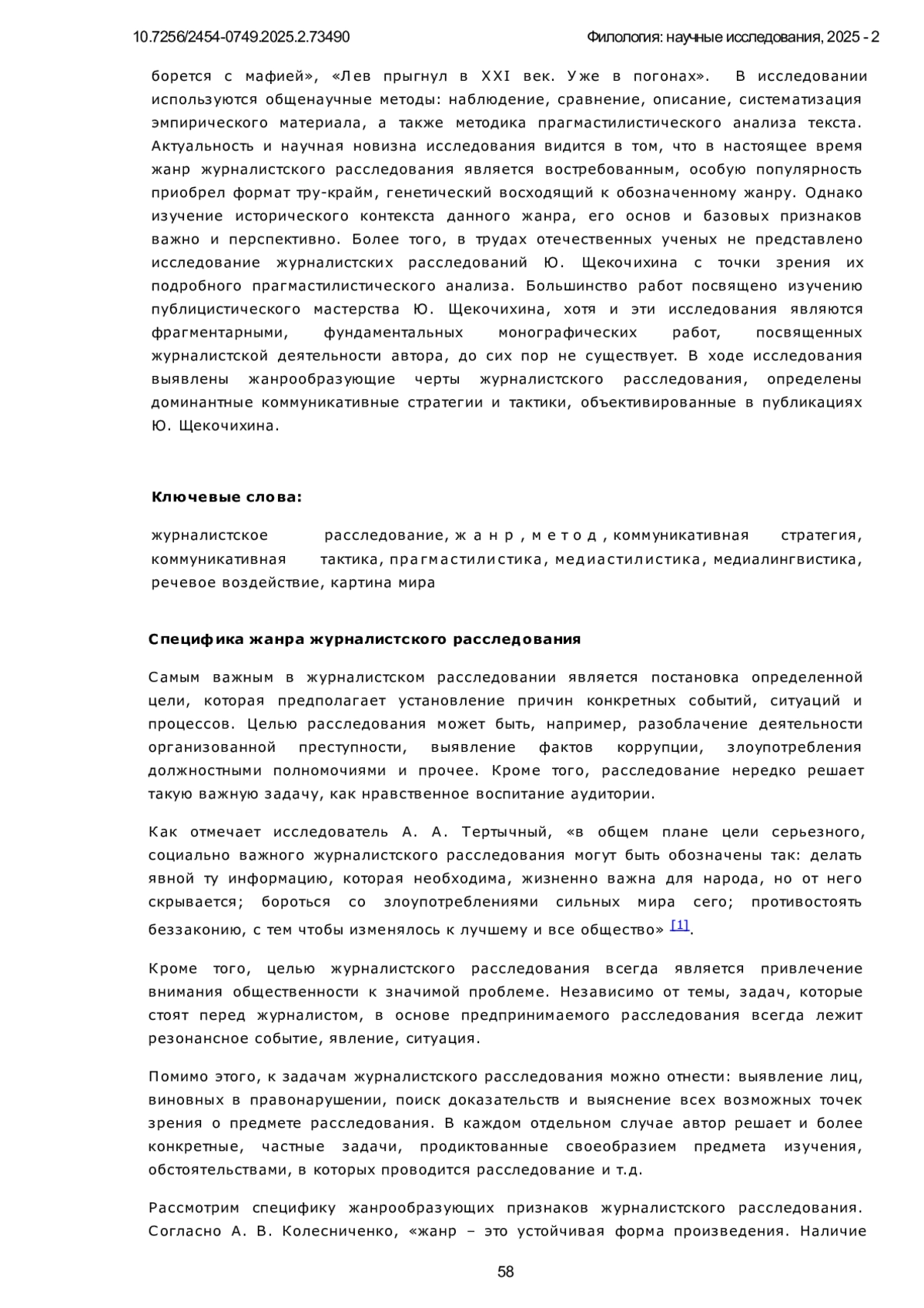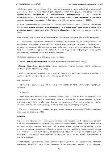 Предметом исследования является прагмастилистическая специфика жанра журналистского расследования, рассмотренная на примере газетных публикаций Ю. Щекочихина, стоявшего у истоков данного жанра. В эмпирическую базу исследования вошли журналистские расследования Ю. Щекочихина, объединенные общей темой, - появление и развитие организованной преступности, мафии в СССР и постсоветской России, опубликованные в «Литературной газете»: «Лев прыгнул!», «Лев прыгнул: взгляд из-за океана», «Под контролем мафии», «Охота на льва, или бой с тенью», «Гуров ушел… Лев съел?», «Чужой», «Здравствуй, дорогая мафия», а также расследования, вышедшие на страницах «Новой газеты»: «Хорошо живется тем, кто борется с мафией», «Лев прыгнул в XXI век. Уже в погонах». В исследовании используются общенаучные методы: наблюдение, сравнение, описание, систематизация эмпирического материала, а также методика прагмастилистического анализа текста. Актуальность и научная новизна исследования видится в том, что в настоящее время жанр журналистского расследования является востребованным, особую популярность приобрел формат тру-крайм, генетический восходящий к обозначенному жанру. Однако изучение исторического контекста данного жанра, его основ и базовых признаков важно и перспективно. Более того, в трудах отечественных ученых не представлено исследование журналистских расследований Ю. Щекочихина с точки зрения их подробного прагмастилистического анализа. Большинство работ посвящено изучению публицистического мастерства Ю. Щекочихина, хотя и эти исследования являются фрагментарными, фундаментальных монографических работ, посвященных журналистской деятельности автора, до сих пор не существует. В ходе исследования выявлены жанрообразующие черты журналистского расследования, определены доминантные коммуникативные стратегии и тактики, объективированные в публикациях Ю. Щекочихина.