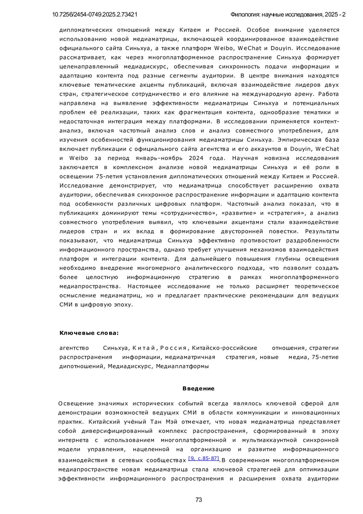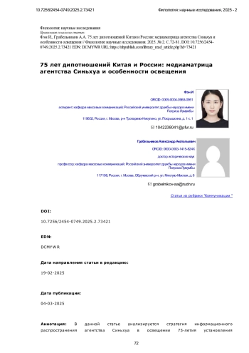 В данной статье анализируется стратегия информационного распространения агентства Синьхуа в освещении 75-летия установления дипломатических отношений между Китаем и Россией. Особое внимание уделяется использованию новой медиаматрицы, включающей координированное взаимодействие официального сайта Синьхуа, а также платформ Weibo, WeChat и Douyin. Исследование рассматривает, как через многоплатформенное распространение Синьхуа формирует целенаправленный медиадискурс, обеспечивая синхронность подачи информации и адаптацию контента под разные сегменты аудитории. В центре внимания находятся ключевые тематические акценты публикаций, включая взаимодействие лидеров двух стран, стратегическое сотрудничество и его влияние на международную арену. Работа направлена на выявление эффективности медиаматрицы Синьхуа и потенциальных проблем её реализации, таких как фрагментация контента, однообразие тематики и недостаточная интеграция между платформами. В исследовании применяется контент-анализ, включая частотный анализ слов и анализ совместного употребления, для изучения особенностей функционирования медиаматрицы Синьхуа. Эмпирическая база включает публикации с официального сайта агентства и его аккаунтов в Douyin, WeChat и Weibo за период январь-ноябрь 2024 года. Научная новизна исследования заключается в комплексном анализе новой медиаматрицы Синьхуа и её роли в освещении 75-летия установления дипломатических отношений между Китаем и Россией. Исследование демонстрирует, что медиаматрица способствует расширению охвата аудитории, обеспечивая синхронное распространение информации и адаптацию контента под особенности различных цифровых платформ. Частотный анализ показал, что в публикациях доминируют темы «сотрудничество», «развитие» и «стратегия», а анализ совместного употребления выявил, что ключевыми акцентами стали взаимодействие лидеров стран и их вклад в формирование двусторонней повестки. Результаты показывают, что медиаматрица Синьхуа эффективно противостоит раздробленности информационного пространства, однако требует улучшения механизмов взаимодействия платформ и интеграции контента. Для дальнейшего повышения глубины освещения необходимо внедрение многомерного аналитического подхода, что позволит создать более целостную информационную стратегию в рамках многоплатформенного медиапространства. Настоящее исследование не только расширяет теоретическое осмысление медиаматриц, но и предлагает практические рекомендации для ведущих СМИ в цифровую эпоху.