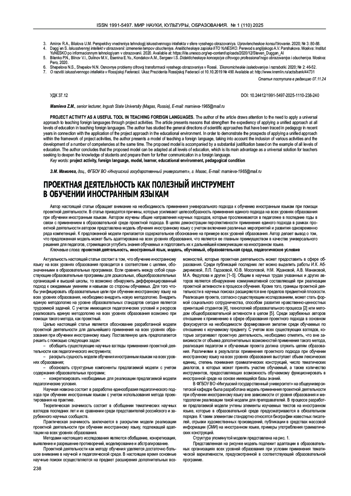 Данная статья посвящена описанию практических результатов применения метода проектов в процессе обучения иностранному языку на уровне среднего профессионального образования в вузе. Приводятся результаты анкетирования обучающихся по направлениям среднего профессионального образования в Башкирском государственном аграрном университете. Несмотря на то, что проектная деятельность практикуется на всех ступенях образования, начиная со старшей школы, многие студенты не имеют навыка подготовки результатов исследования в виде проекта. Метод проектов нацелен на индивидуализацию образования, с одной стороны, и выработку навыка групповой работы - с другой. Раскрываются возможности проектной деятельности на занятиях по иностранному языку, позволяющие обучающимся применять накопленные языковые знания в речи, развить не только языковые и речевые, но также и коммуникативные компетенции. Исследование базируется на положении о том, что проект - это от души выполняемый замысел на основе личного интереса студента, направленный на повышение мотивации к изучению иностранного языка.