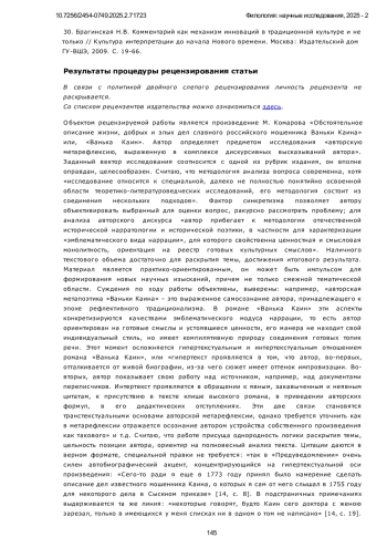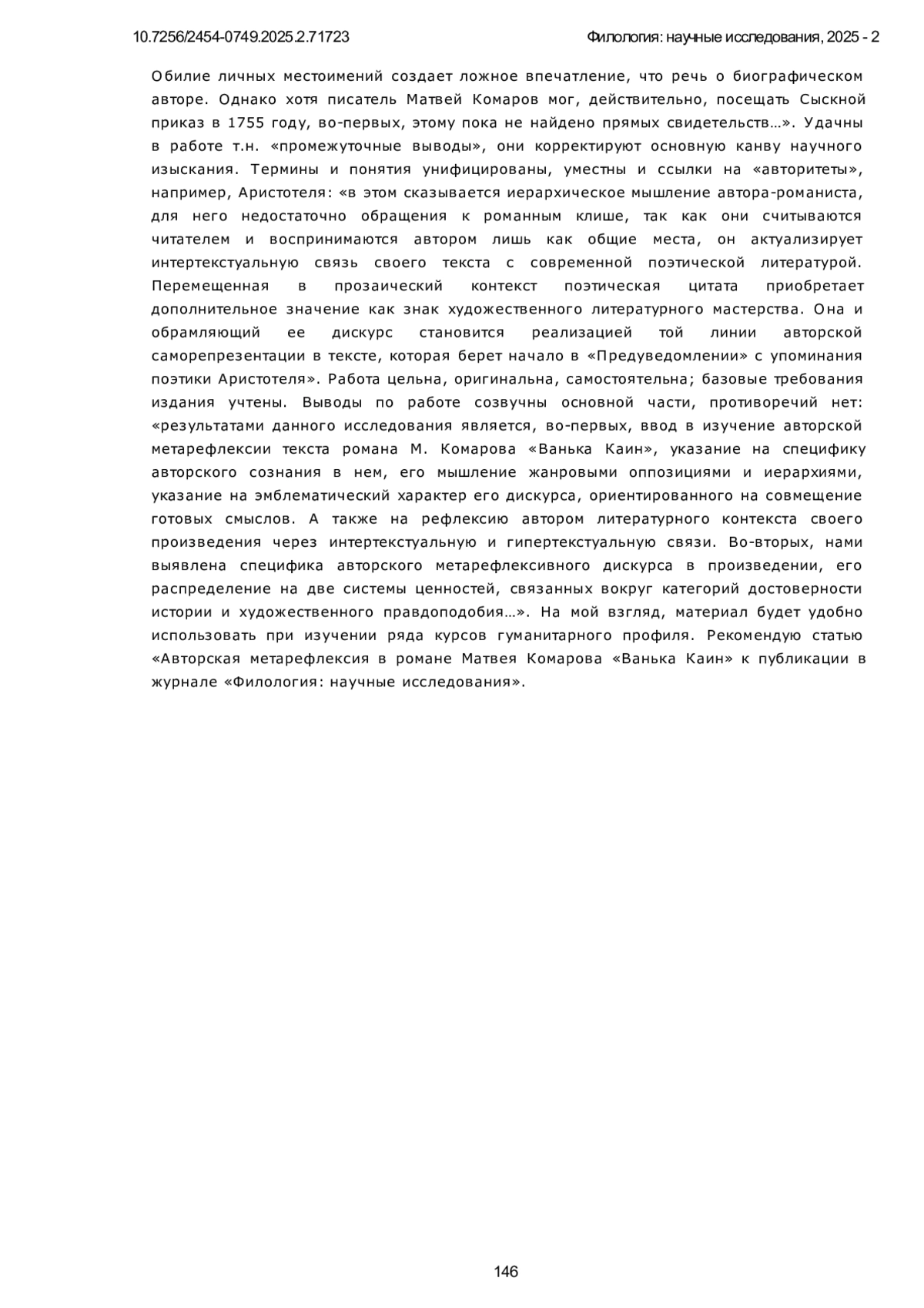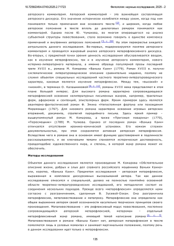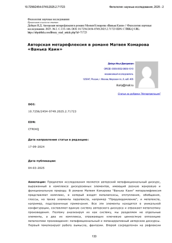 Предметом исследования является авторский метафикциональный дискурс, выраженный в комплексе дискурсивных элементов, имеющий разную жанровую и функциональную природу. В романе Матвея Комарова “Ванька Каин” метаралефлексия представляет комплекс, в который входят металепсисы, отступления, обобщения, глоссы, но также элементы паратекста, например “Предуведомление”, и метатекста, например, подстраничные примечания. Все эти элементы находятся в уникальной конфигурации, составляют единую систему авторского дискурса и отражают метапоэтику произведения. Поэтому анализируя их как систему, мы разделяем не отдельные элементы, а два их комплекса, отражающих ключевую ценностную оппозицию метапоэтики произведения: метафикциональный и метанарративный авторские дискурсы. Первый тематизирует работу вымысла, фантазии. Второй сосредоточен на рефлексии литературной и риторической формы. В романе Комарова они имеют собственную специфику, свойственную риторическому сознанию, модифицированному народной традицией лубочной литературы. В исследовании мы пользуемся телеологическим подходом, выработанным в отечественной филологии А. Скафтымовым. Вслед за Ю. Чумаковым мы включаем авторские примечания в текст произведения. На основе постклассической немецкой нарратологии мы разделяем метафикциональный и метанарративный авторские комментарии. На основе систематизации Ж. Женеттом транстекстуальных связей выделяем гипертекстуальную и интертекстуальную связи данного романа. Новизна исследования заключается в рассмотрении авторской метапоэтики в раннем творчестве Матвея Комарова. В аналитическом выделении ее эксплицитного, вербализованного автором вида, в комментарии, что ранее не становилось предметом исследования. Это потребовало методологически инновативного совмещения перспектив имманентного анализа литературного произведения и нарратологического анализа авторского, в ходе которого стало возможно выделение двух, метанарративной и метафикциональной, системы авторских суждений в тексте. При этом за счет специфики предмета особо ценными результатами исследования стало выявление особенностей литературного сознания Матвея Комарова. Концептуализация им литературности как качества формы, риторического восприятия вымысла как приема. И, напротив, опоры на свидетельство и на опыт в сюжетном оформлении истории, понимание ее природы как отражения действительности, эмблематическое видение ее как фрагмента, имеющего дидактическую ценность.