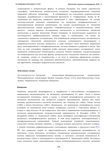 Проблема авторской метарефлексии в зарубежных и отечественных исследованиях традиционно рассматривается на материале произведений ХХ века. Часто в рамках исследования метапрозы, прозе о прозе, в которой метарефлексия реализуется как авторское размышление над процессом создания произведения. Однако уже такие пионеры диахронического изучения метапрозы, как Патриша В о (1984), Линда Хатчен (1984) и Ингер Кристенсен (1981), обнаружили, что проявления метарефлексии можно усмотреть на протяжении всей истории литературы, начиная с «Тристрама Шенди» Л. Стерна и «Дон Кихота» М. де Сервантеса. При этом в современном литературоведении, в частности представителями постклассической нарратологии В. В ольфом (1993), М. Флудерник (2004), А. Ньюннингом (2005), была проведена классификация компонентов авторского метарефлексивного дискурса. В нем были выделены метанарративный и метафикциональный комментарий. Первый анализирует устройство повествования, осмысляет систему речевых приемов, с помощью которых рассказчик излагает историю, а второй посвящен референциальному соотношению нарратива и реального мира [1, c. 28].