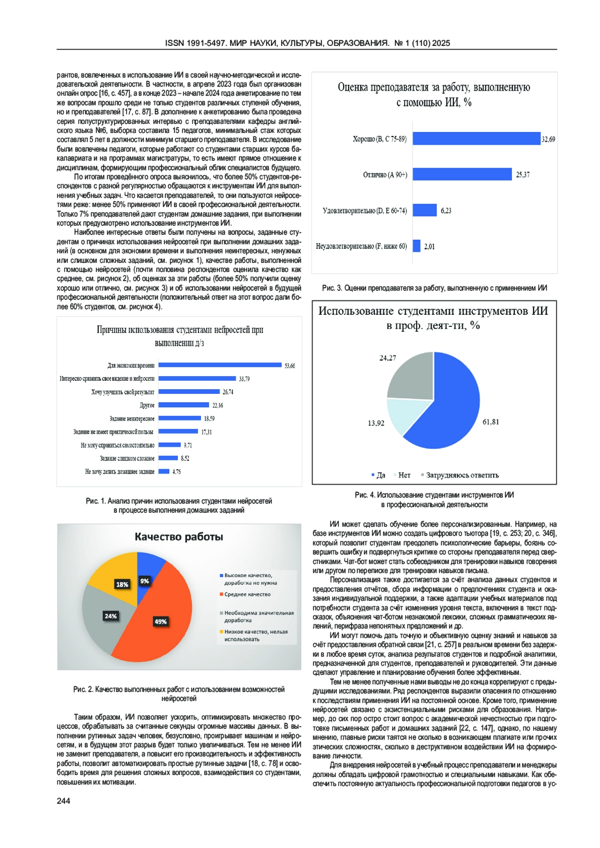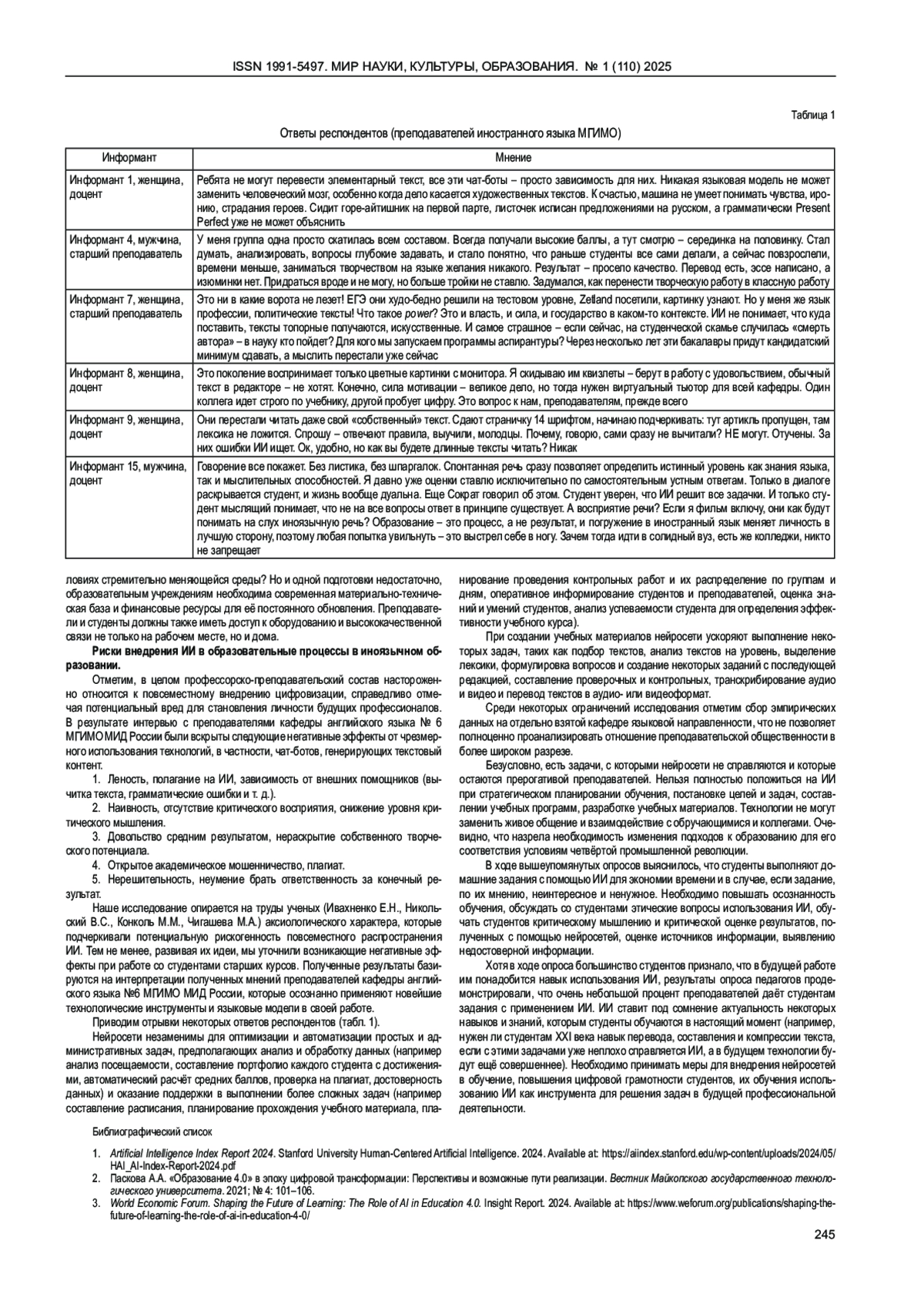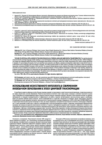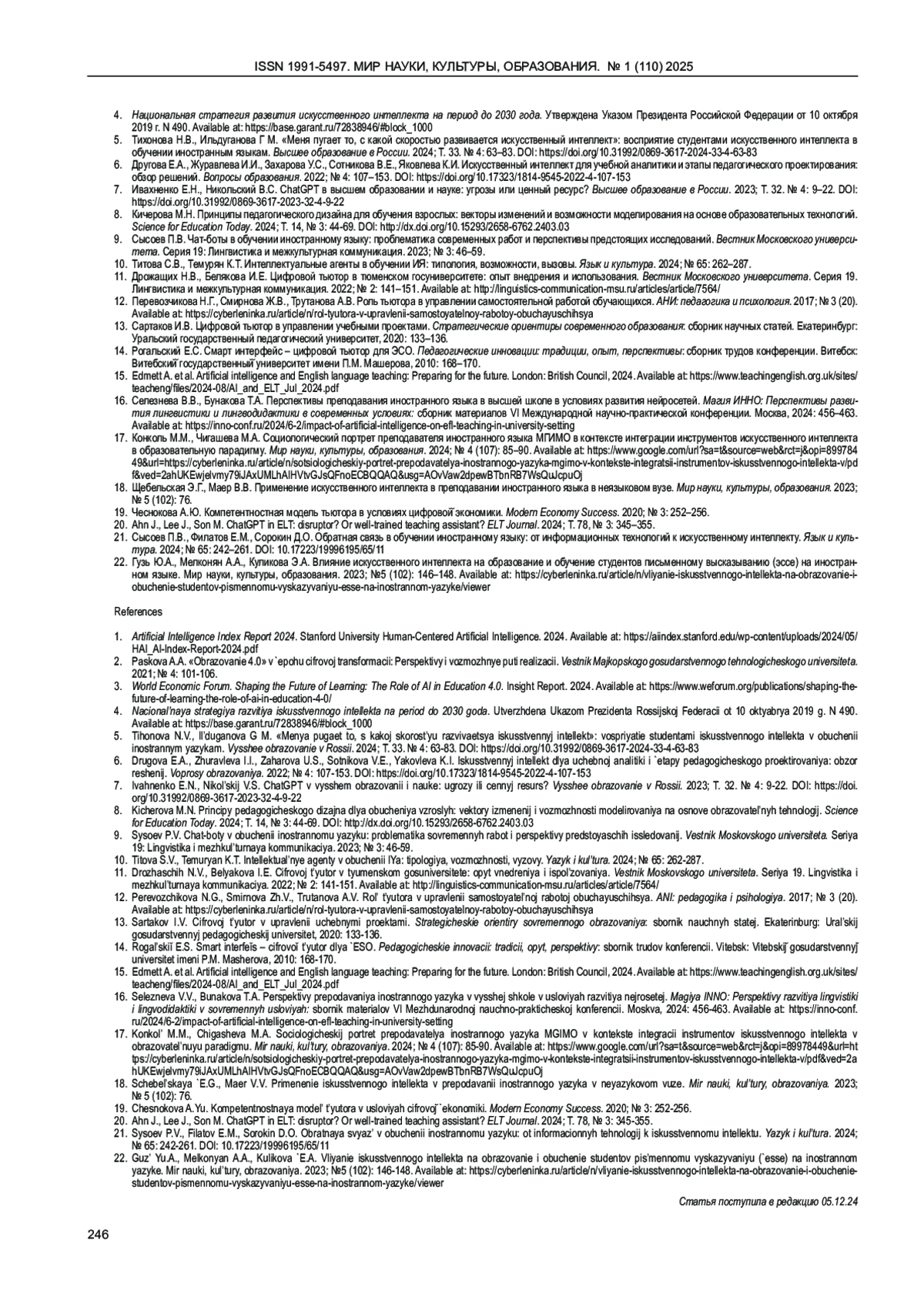 5. 	Тихонова Н.В., Ильдуганова Г М. “Меня пугает то, с какой скоростью развивается искусственный интеллект”: восприятие студентами искусственного интеллекта в обучении иностранным языкам. Высшее образование в России. 2024; Т 33. № 4: 63-83. DOI: 10.31992/0869-3617-2024-33-4-63-83 EDN: FNUAVR