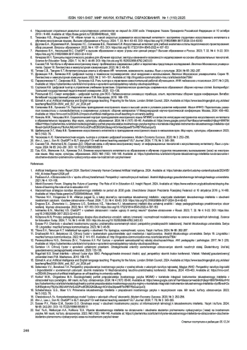 7. 	Ивахненко Е.Н., Никольский В.С. ChatGPT в высшем образовании и науке: угрозы или ценный ресурс? Высшее образование в России. 2023; Т 32. № 4: 9-22. DOI: 10.31992/0869-3617-2023-32-4-9-22 EDN: TZHIHU